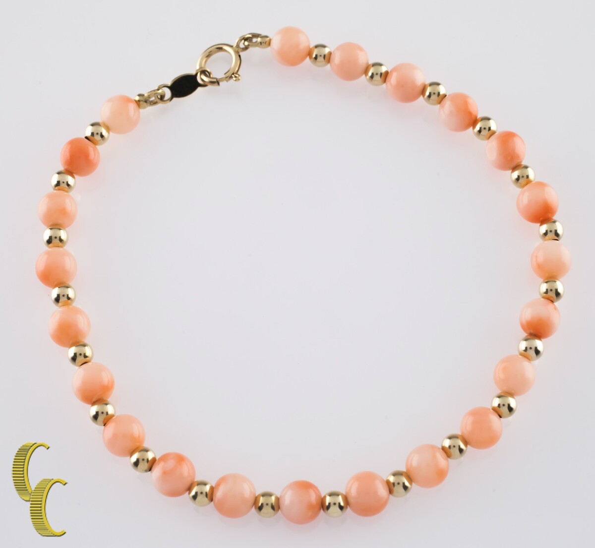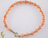 14k Oro Giallo Perlina E Rotondo Corallo Bracciale W/ Gancetto a Levetta 6.75 "
