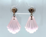 14k white gold rose quartz drop earrings featuring specially carved fan or shell shaped stones. These are hand carved stones and are a nice light pink color, but the carving is not identical. The earrings measure 1" long with post and friction backs. The rose quartz stones measure about 16.5mm x 13mm.