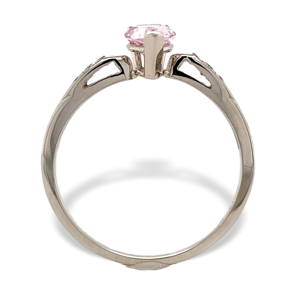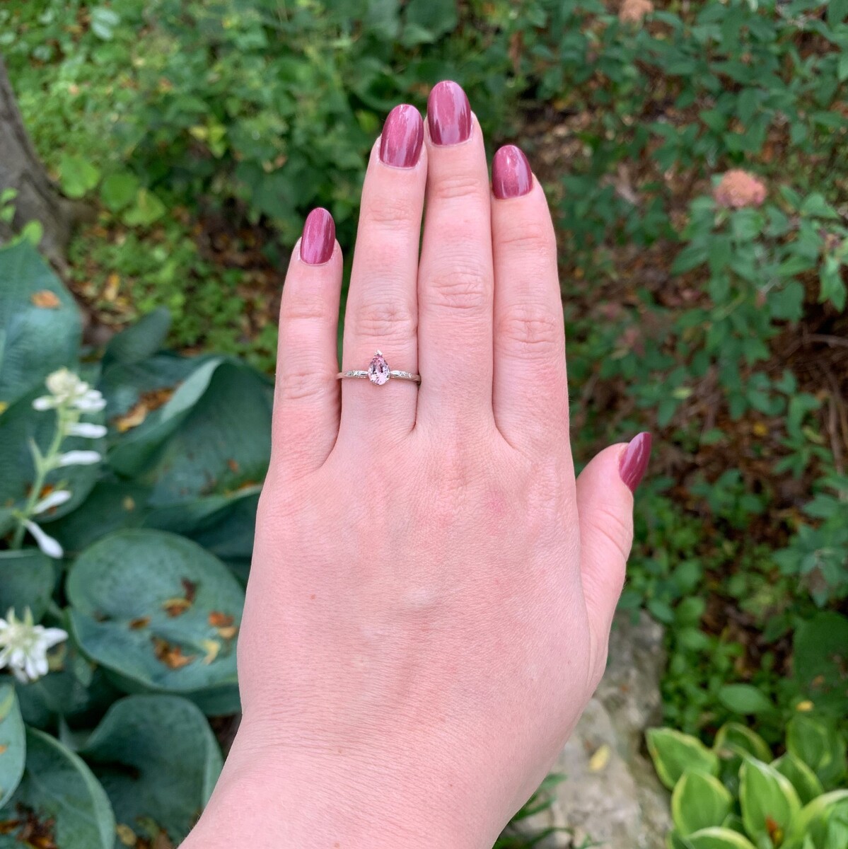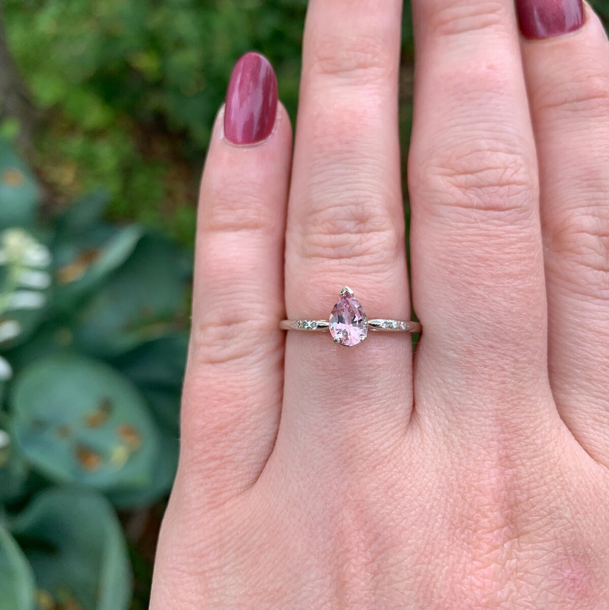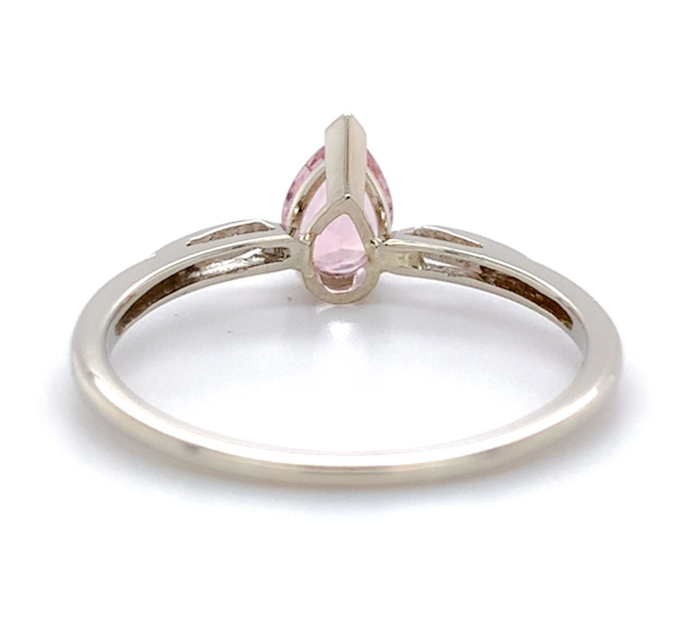 14k white gold vintage ring featuring a pear cut pink morganite weighing .60cts. The morganite has light pink color and measures about 7mm x 5mm. Morganite is the peach or pink variety of beryl (aquamarine). There are six tiny single cut round earth mined diamond accents. The prongs on the diamonds are worn.