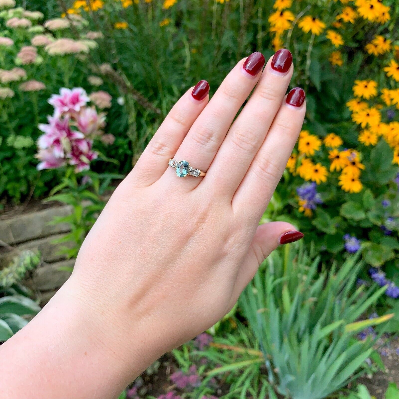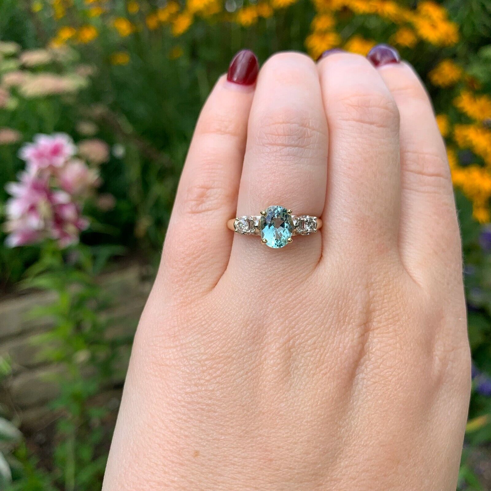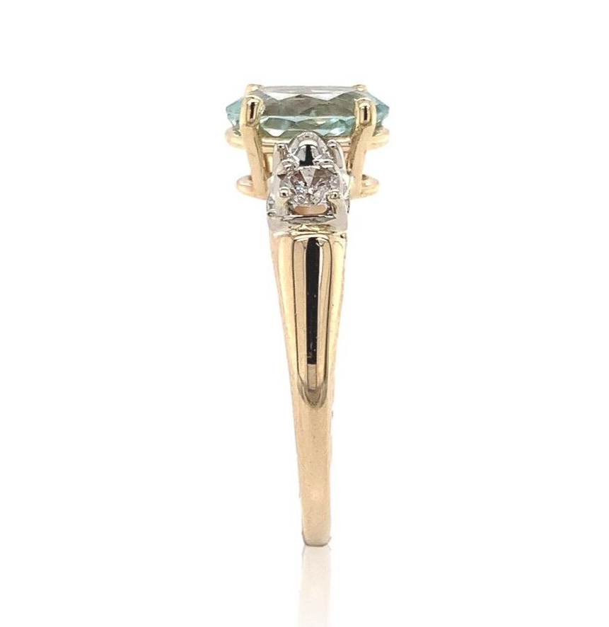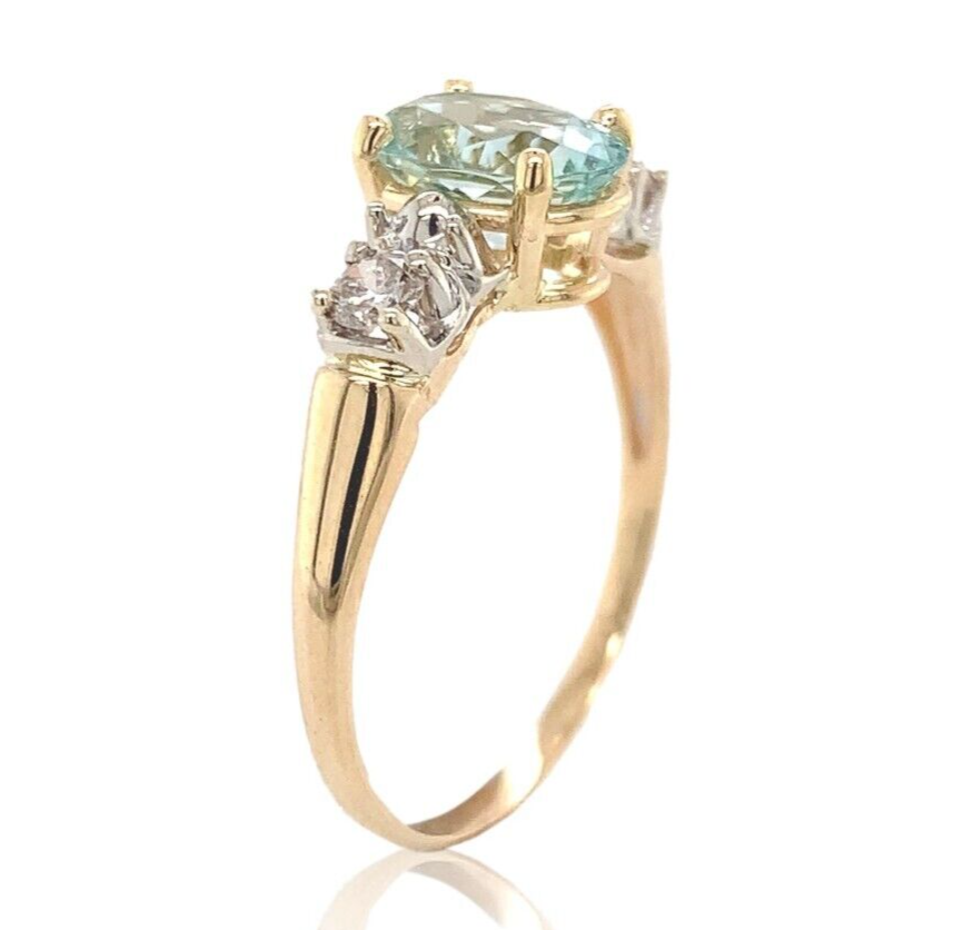 14k yellow gold ring with white gold accents featuring an oval aquamarine weighing 1.31 carats. The light greenish-blue aqua measures about 8.4mm x 6.2mm. There are two round brilliant cut diamond accents measuring about 2.8mm and weighing about .16cts.