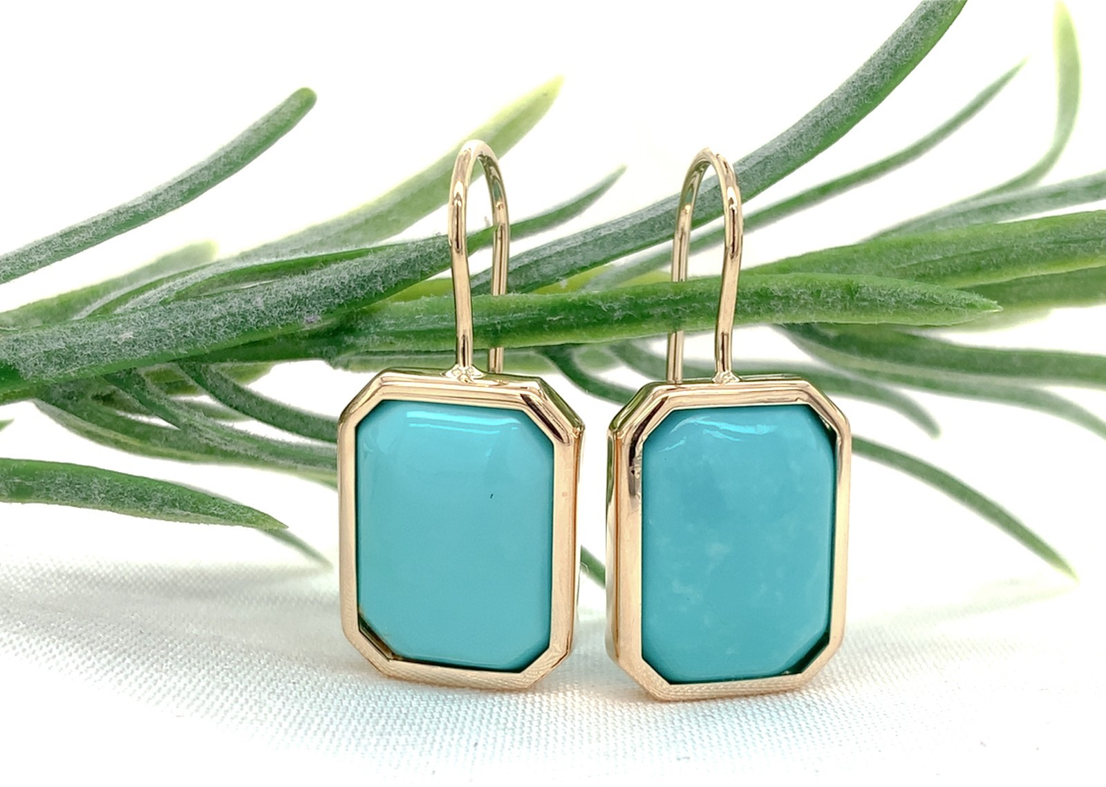 14k yellow gold pair of turquoise drop earrings with wire hooks. This is Kingman turquoise from Arizona, which is the last full-time production mine in the US. The smooth cabochon rectangular turquoise measures about 16mm x 12mm and weighs about 14 carats total. The turquoise is robin's egg blue with almost no veining. The turquoise is not as blue as appears in the photos.