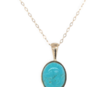 14k yellow gold turquoise pendant. This is Kingman turquoise from Arizona, which is the last full-time production mine in the US. The turquoise measures about 10mm x 8mm and weighs 2.07 carats. The turquoise is robin's egg blue with green veining. The pendant with bail measures just under 3/4" long, and includes a new 14k 18" chain. The necklace weighs 1.15 dwt., and is contemporary. Pretty!