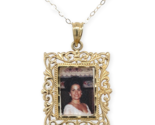 14k yellow gold picture frame pendant. The pendant measures 1" long with bail by 5/8" wide. The frame is made of scrolly filigree and will hold a photo that measures about 1/2" long by a little over 1/4" wide. The pendant includes a new 18" 14k yellow gold chain. The necklace weighs 1.27 dwt., and is contemporary. Wonderful!
