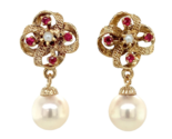 - 14k Yellow Gold Vintage Ruby and Pearl Earrings with 8.9mm Pearl Drops (#J7380)