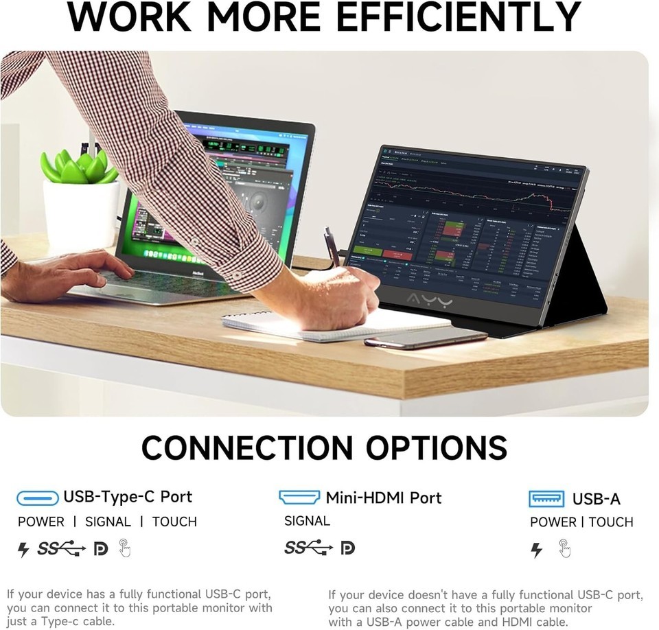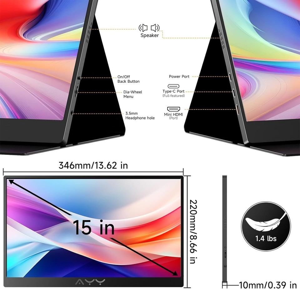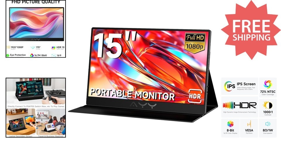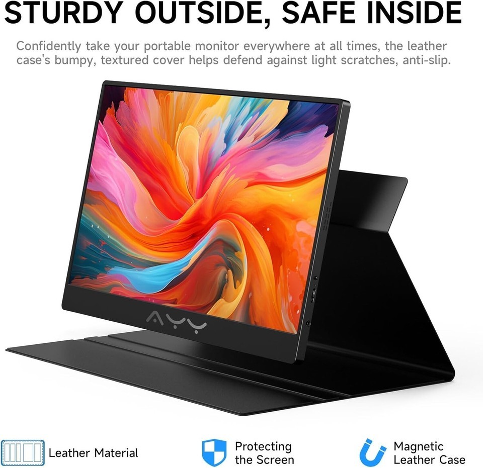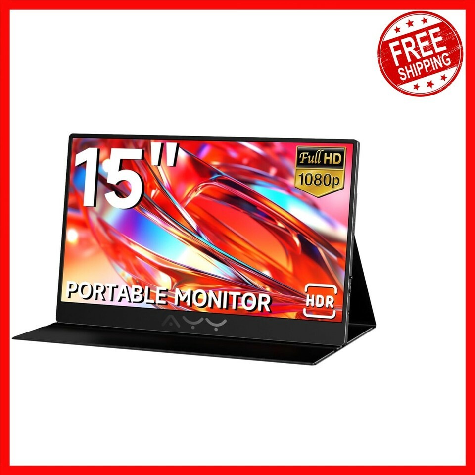 Experience immersive visuals with the AYY 15.6-inch portable monitor, featuring a FHD 1080P HDR IPS screen with wide 170 viewing angles, a 1000:1 contrast ratio, and eye-care technology to reduce blue light and flickering. Its ultra-slim, lightweight design (1.43 pounds) is complemented by a smart magnetic leather cover that doubles as a stand, making it perfect for travel, work, or play. Enhanced with VESA mount compatibility, dual speakers, and a 3.5mm audio jack, this versatile display seamlessly connects via Type-C or HDMI to a variety of devices, including laptops, tablets, smartphones, and gaming consoles. Complete with accessories for immediate use, backed by a 1- and lifetime technical support?your reliable second screen for productivity or entertainment. To ensure fast and reliable delivery, we work with multiple fulfillment partners and suppliers. Depending on availability and location, your order may ship from different warehouses or arrive in packaging that varies from item to item. Tracking details are typically provided shortly after shipment, and customer satisfaction remains our top priority. Please note that due to carrier policies and regional regulations, certain items may not be eligible for delivery to specific states or territories.