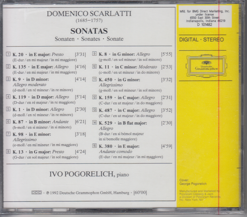 15 Sonatas by Scarlatti / Pogorelich (CD) Classical Music BMG Club Release