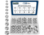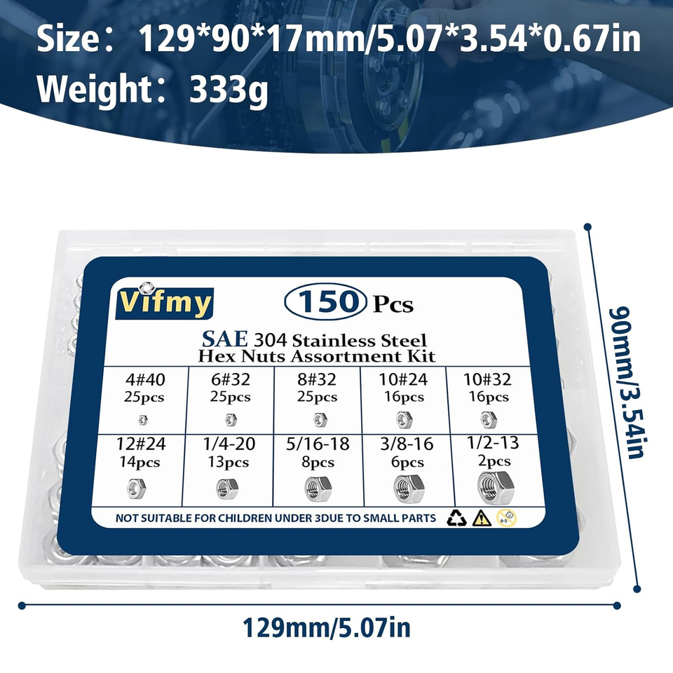Hardware Nuts Size: This 150-piece SAE Hex Nut Assortment Kit includes a comprehensive selection of sizes: 4#40 (25 pcs), 6#32 (25 pcs), 8#32 (25 pcs), 10#24 (16 pcs), 10#32 (16 pcs), 12#24 (14 pcs), 1/4-20 (13 pcs), 5/16-18 (8 pcs), 3/8-16 (6 pcs), and 1/2-13 (2 pcs). This variety ensures that you have the right nut for virtually any project, accommodating a wide range of applications.