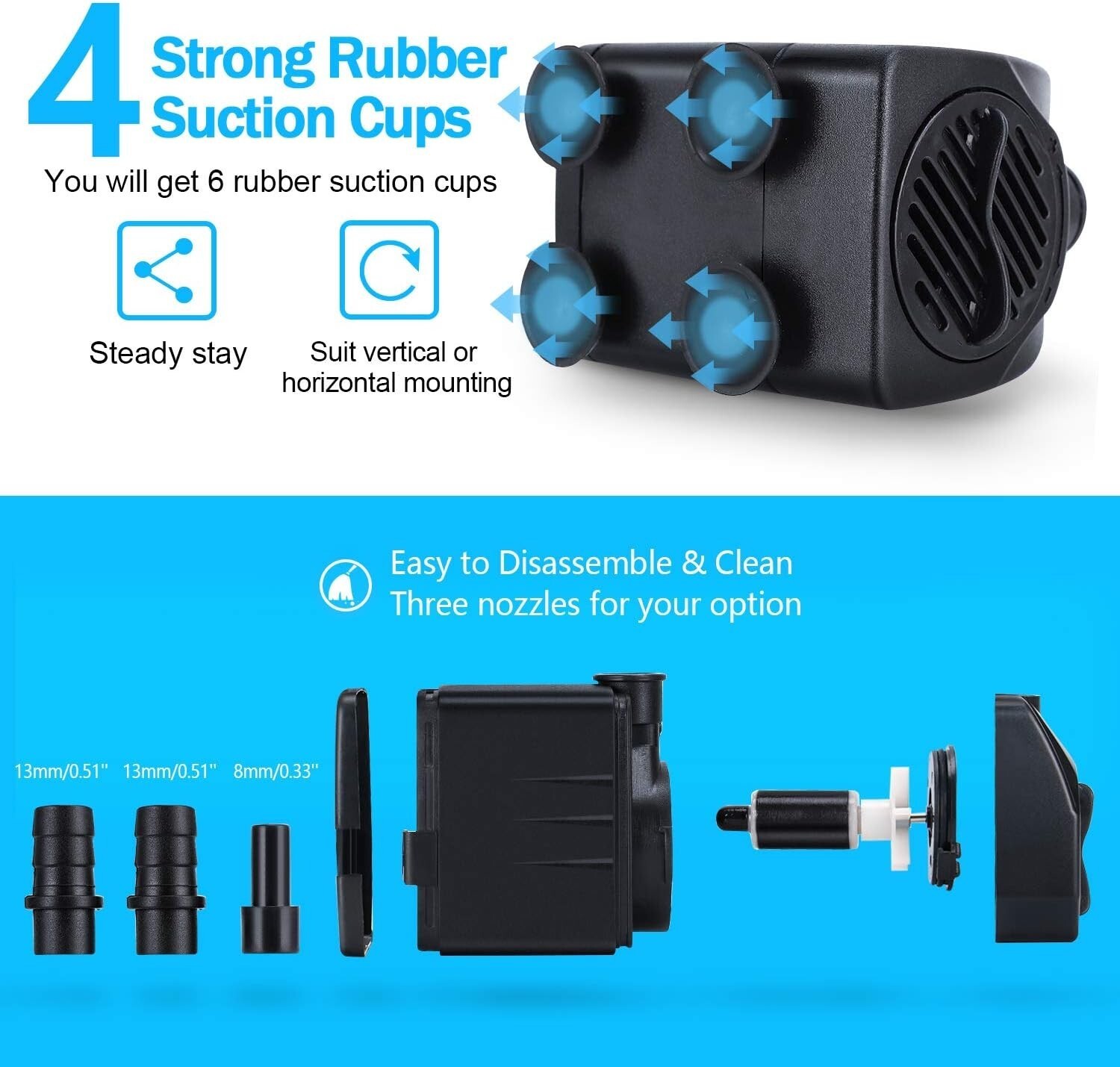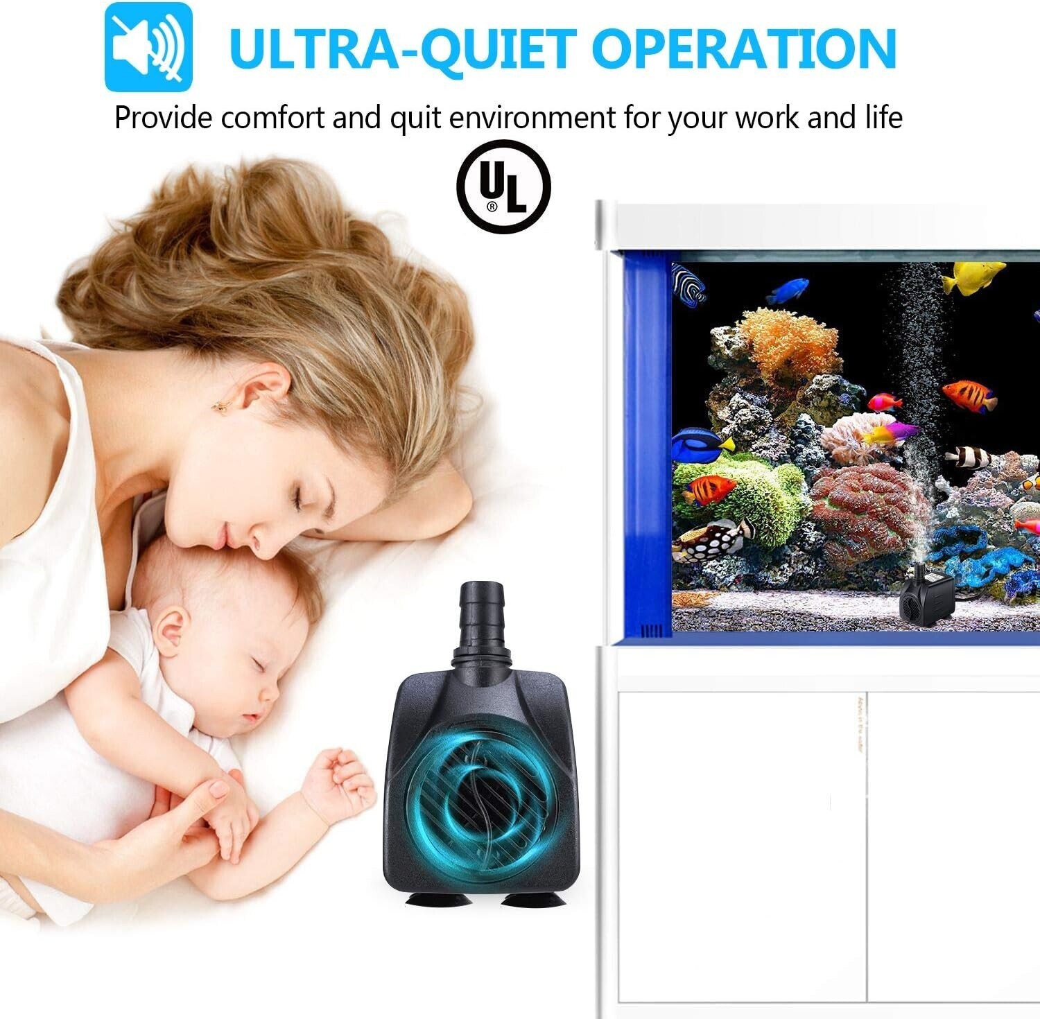 Enhance your outdoor or indoor space with our ultra-quiet fountain pump, designed to create a peaceful, natural ambiance. Its compact yet powerful 15W motor delivers a maximum flow of 220 GPH with adjustable water pressure and three versatile nozzles for customized views. Perfect for aquariums, ponds, fountains, and hydroponic systems, it features easy-to-clean components, durable stainless steel impeller, and strong suction cups to ensure stability. Enjoy tranquil water sounds and a near-natural environment for your aquatic life with this reliable, easy-to-use pump.