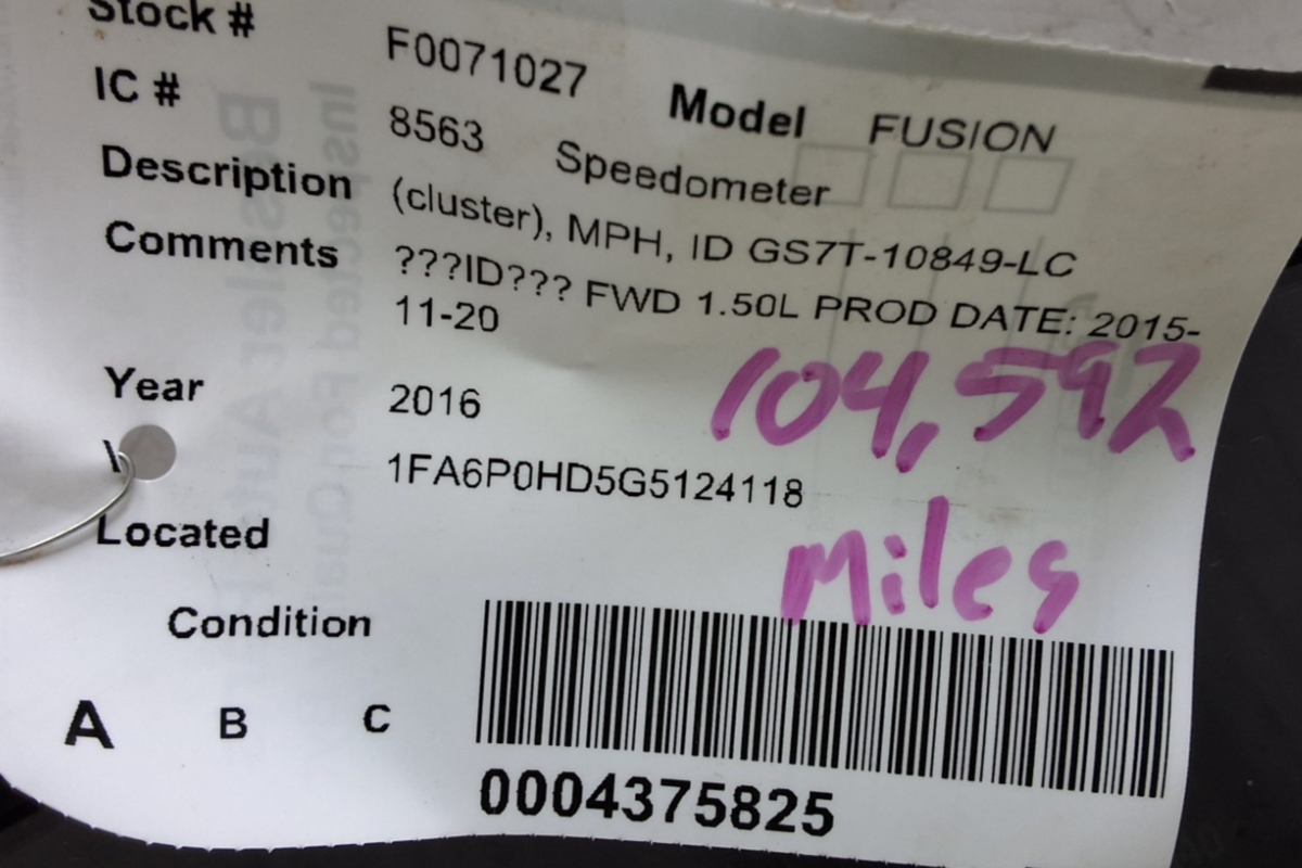 2016 Ford Fusion MPH speedometer, 104,592 miles. Part number GS7T-10849-JA thru GS7T-10849-JD.