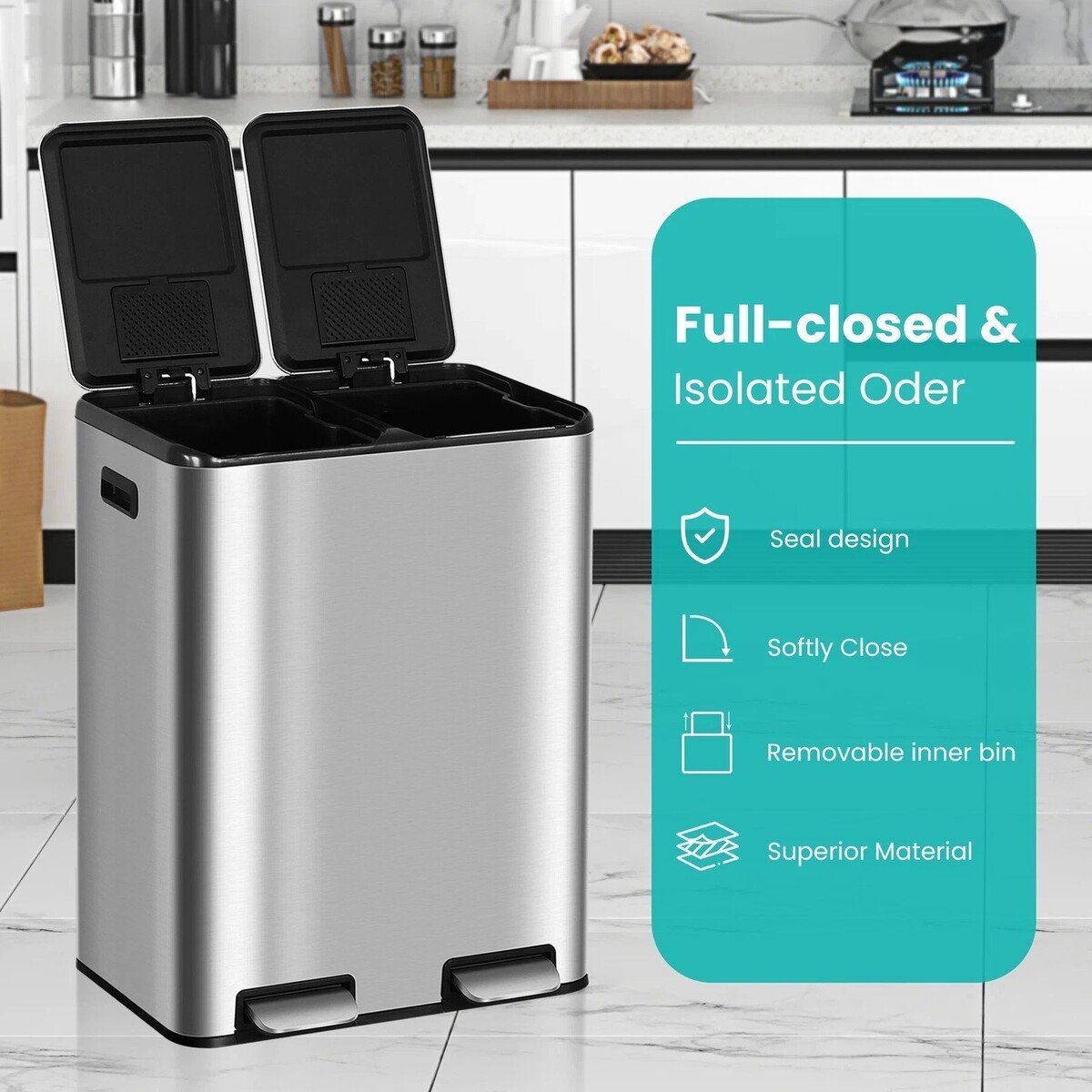 16 Gallon Stainless Steel Kitchen Trash Can Dual Compartment Step On Garbage Bin