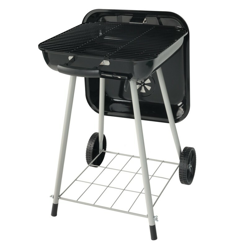 The new Expert Grill 17.5'' square charcoal grill with wheels is perfect for all your backyard family gatherings. This budget friendly grill features a porcelain coated cooking grate, fire bowl and lid for great performance and durability. Easy to adjust dampers help manage grilling temperatures by allowing more or less oxygen into the grill with a simple turn. With 302 square inches of cooking space, The Expert Grill 17.5'' charcoal grill with wheels provides ample cooking space for up to 16 burgers at once or all your favorite foods. Wheels on the back legs make it easy to maneuver the grill around your porch, patio or deck. Assembled product weight is approximately 11.46 lbs.