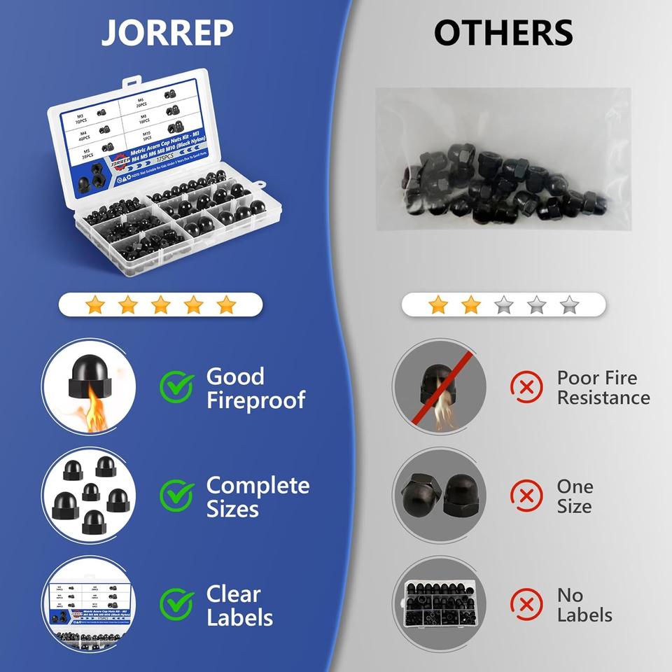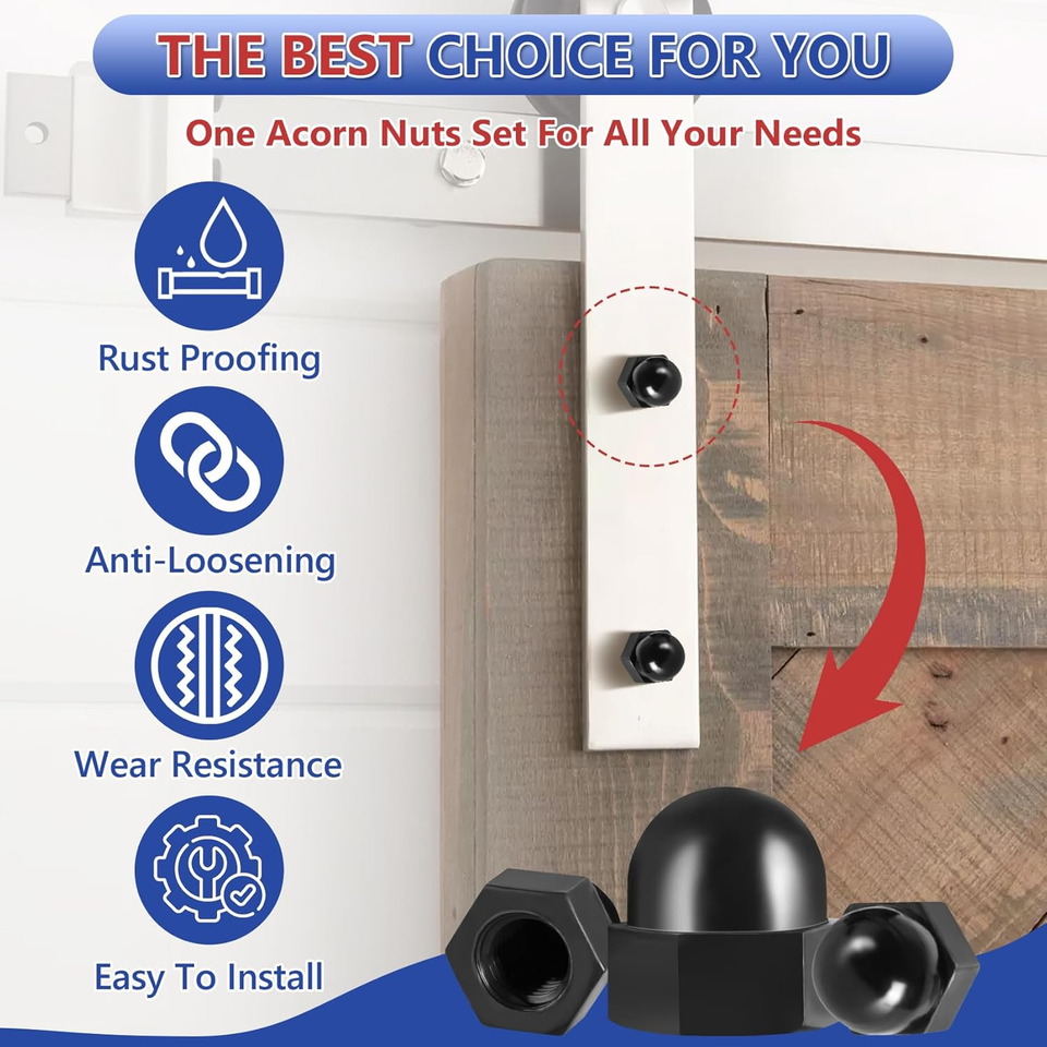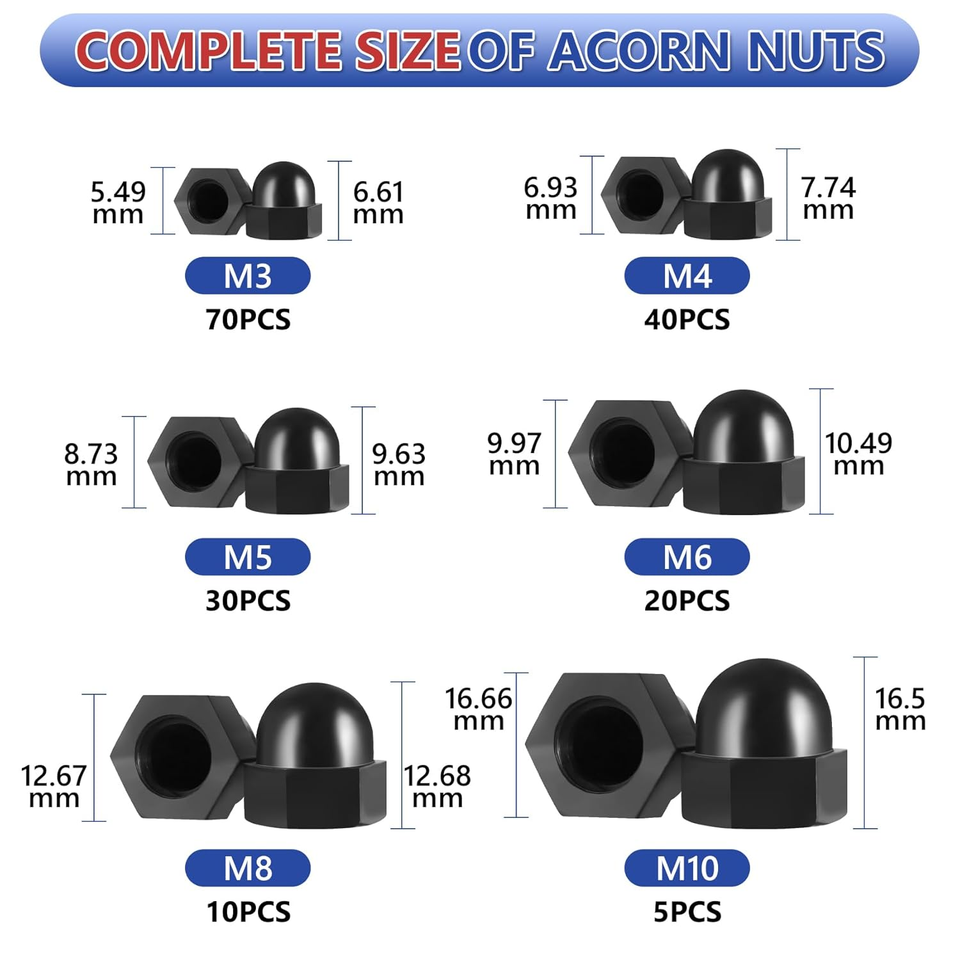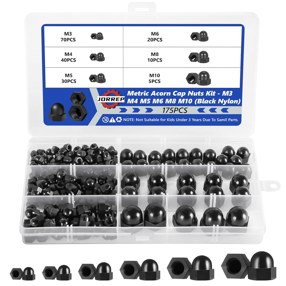 175PCS Metric Black Nylon Hex Acorn Cap Nuts Assortment Kit, M3-M10