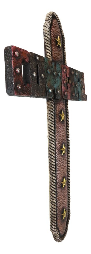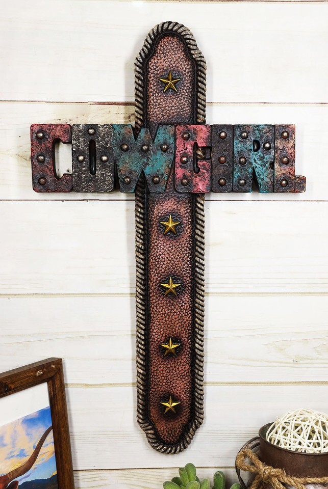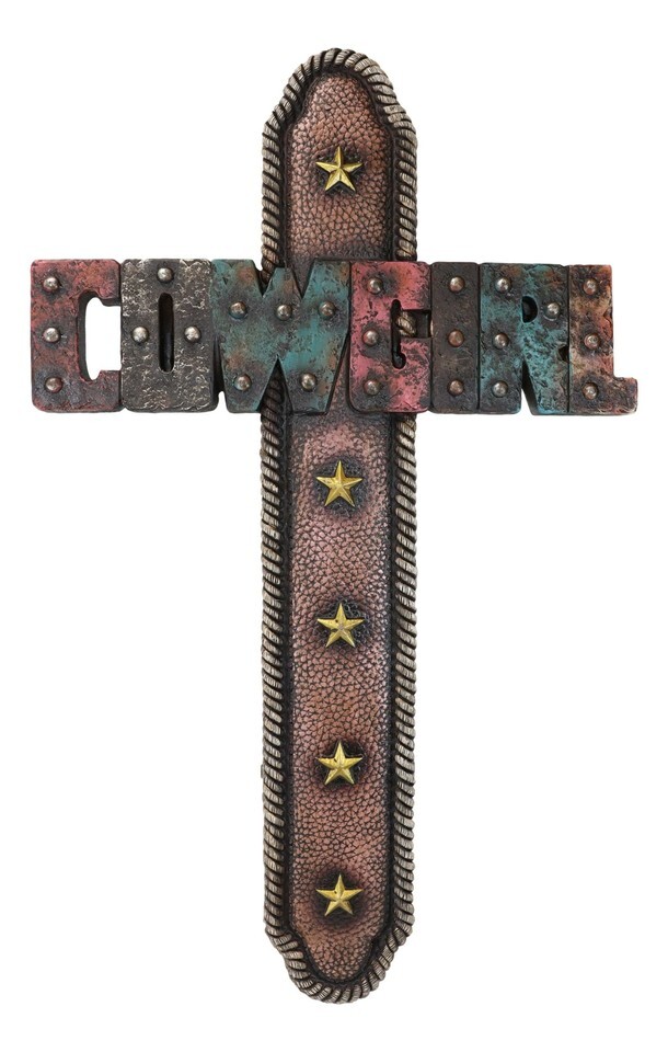 ? Add a touch of Old World western grit to your home or office setup with this wall cross. The western stars, braided ropes, nailheads and the word COWGIRL on the cross will subtly tell your guests of your spiritual, wild west, bigger than life and outdoors personality and disposition.