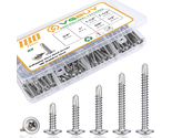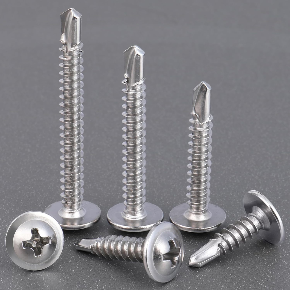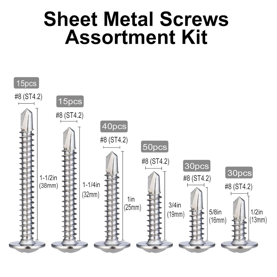 PACKAGE INCLUDED: This comprehensive assortment kit includes 180 pieces of #8 sheet metal screws in various sizes: 50pcs #8 x 3/4", 40pcs #8 x 1", 30pcs #8 x 5/8", 30pcs #8 x 1/2", 15pcs #8 x 1-1/4", and 15pcs #8 x 1-1/2". All screws are crafted from durable stainless steel with a silver finish. SELF DRILLING SCREWS: Designed for efficiency, these screws feature a drill-bit-shaped tip that eliminates the need for a pilot hole, significantly saving time during installation. They are ideal for metal-to-metal or metal-to-wood connections, making them perfect for thin metal applications. DURABLE 410 STAINLESS STEEL MATERIAL: Constructed from 410 stainless steel, these self-tapping screws are corrosion resistant and rustproof, ensuring a long-lasting performance. The high strength of this material prevents deformation, making it suitable for a variety of demanding tasks. WIDE APPLICATION: The versatility of these self-drilling screws allows for use in a range of materials including metal, wood, and plastic. They are commonly employed in metal roofing, HVAC installations, ductwork, and steel framing, effectively securing various components. FINE WORKMANSHIP: Featuring a modified truss head with a Phillips drive, these screws provide a larger surface area to distribute force evenly. This design enhances holding power and minimizes the risk of slipping, ensuring a strong and reliable connection. Product Description Myth 1: All Stainless Steel is Non-magnetic Reality: Stainless steel comes in various alloys, and its magnetism depends on the specific alloy composition. There are magnetic types and non-magnetic types. Myth 2: Stainless Steel Rusts If It?s Magnetic Reality: Magnetic stainless steel alloys can still resist rust and corrosion, just like their non-magnetic counterparts. Magnetism does not dictate corrosion resistance. Stainless Steel Types: Ferritic, such as 409, 430, 439. Magnetic Austenitic, such as 304, 316. Non-Magnetic or weak magnetic