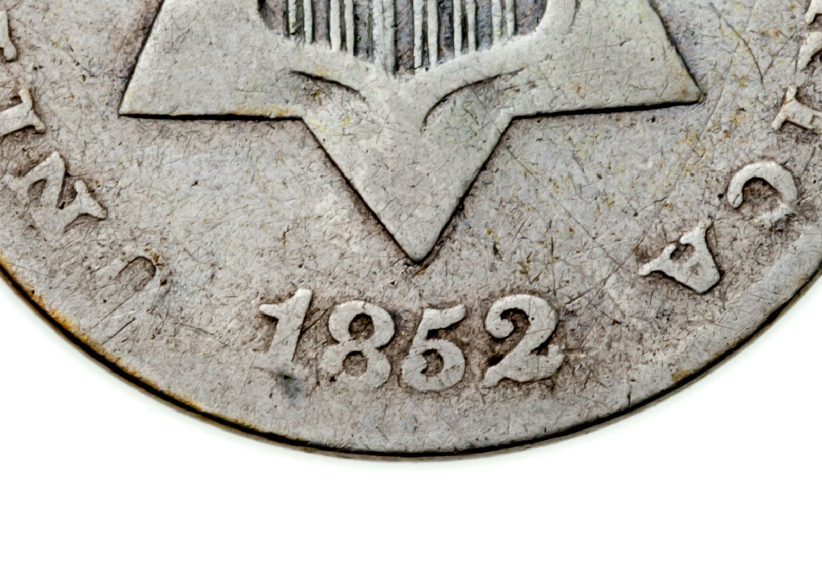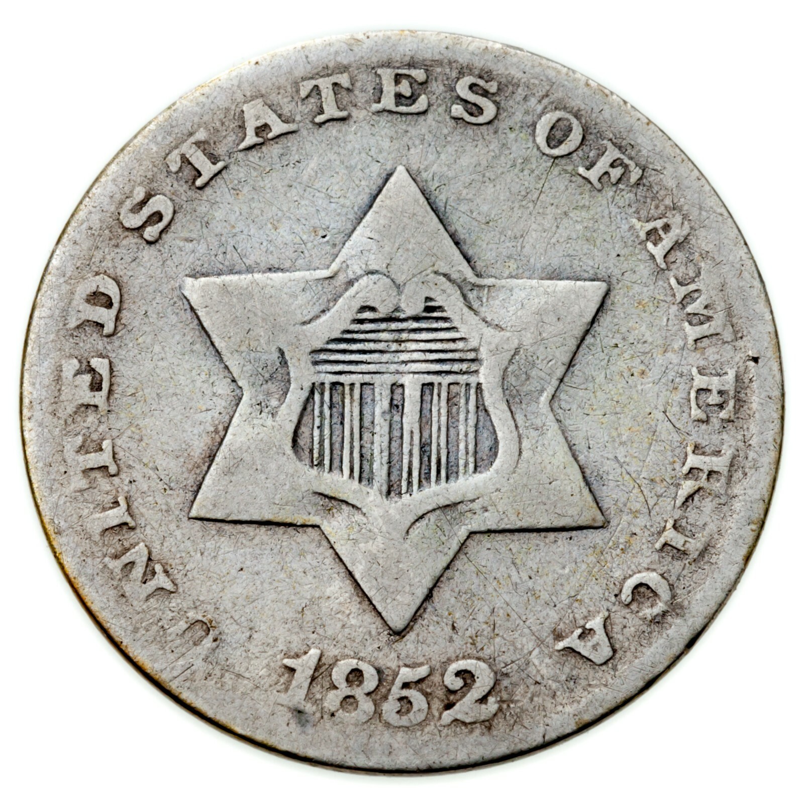 1852 3 Cent Silver Piece in Good Condition, Full Rims, Gray Color