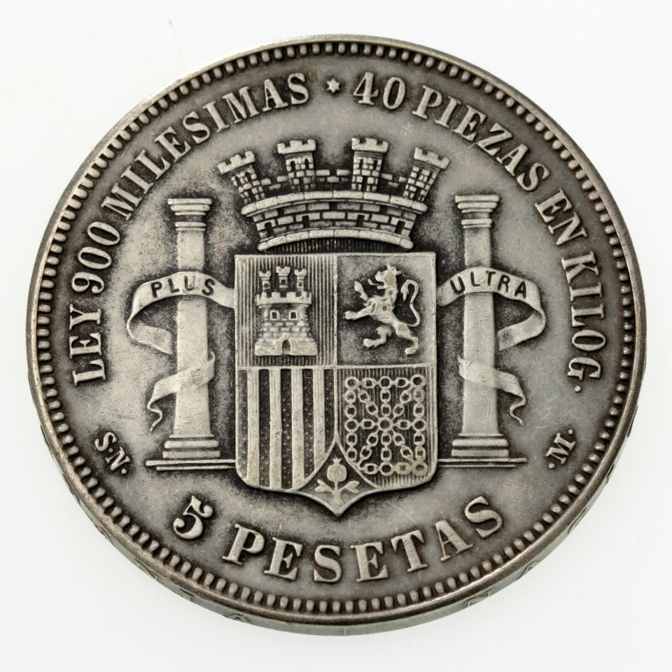 - 1870 Spain 5 Pesetas Silver Coin In Very Fine, KM 655