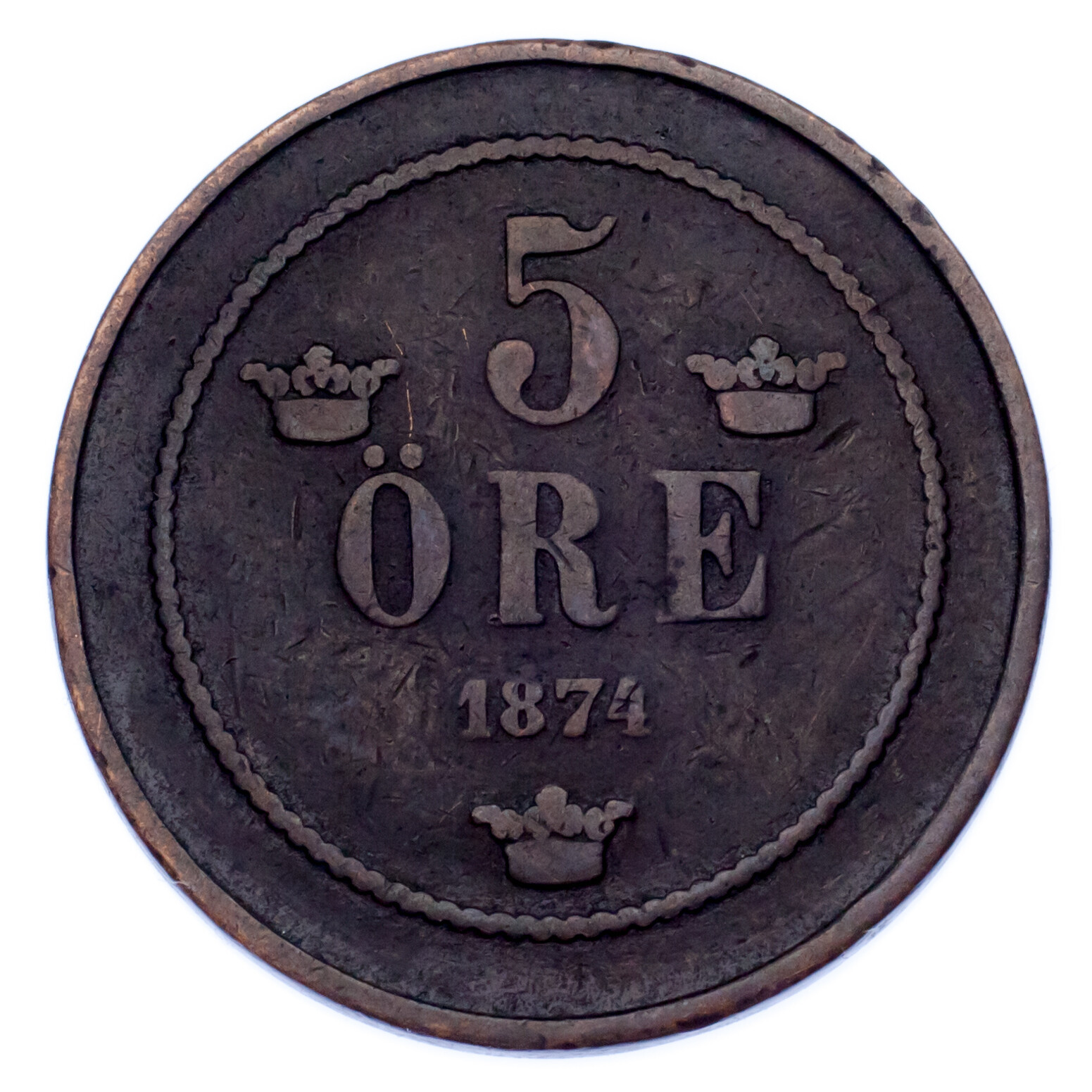 1874 Sweden 5 Ore - Condition: Very Fine - KM# 736