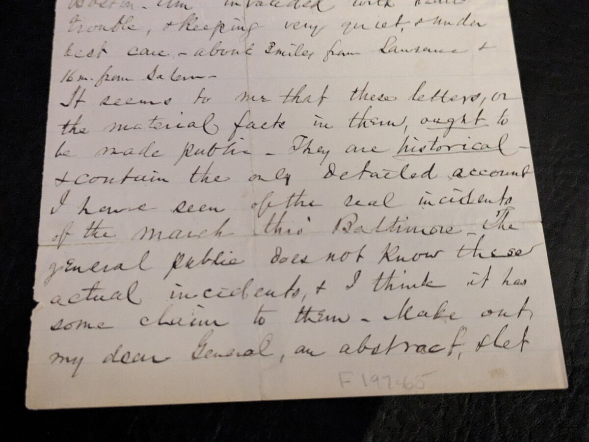The product is an autographed letter from 1883 written by Henry Oliver, the mayor of Salem, Massachusetts during the Civil War. The letter was signed by Oliver and is an original piece not authenticated. The historical significance of this letter lies in the fact that it was written during a turbulent time in American history, specifically the aftermath of the Baltimore Riot. This collectible item offers a glimpse into the past and allows for a unique piece of history to be preserved.