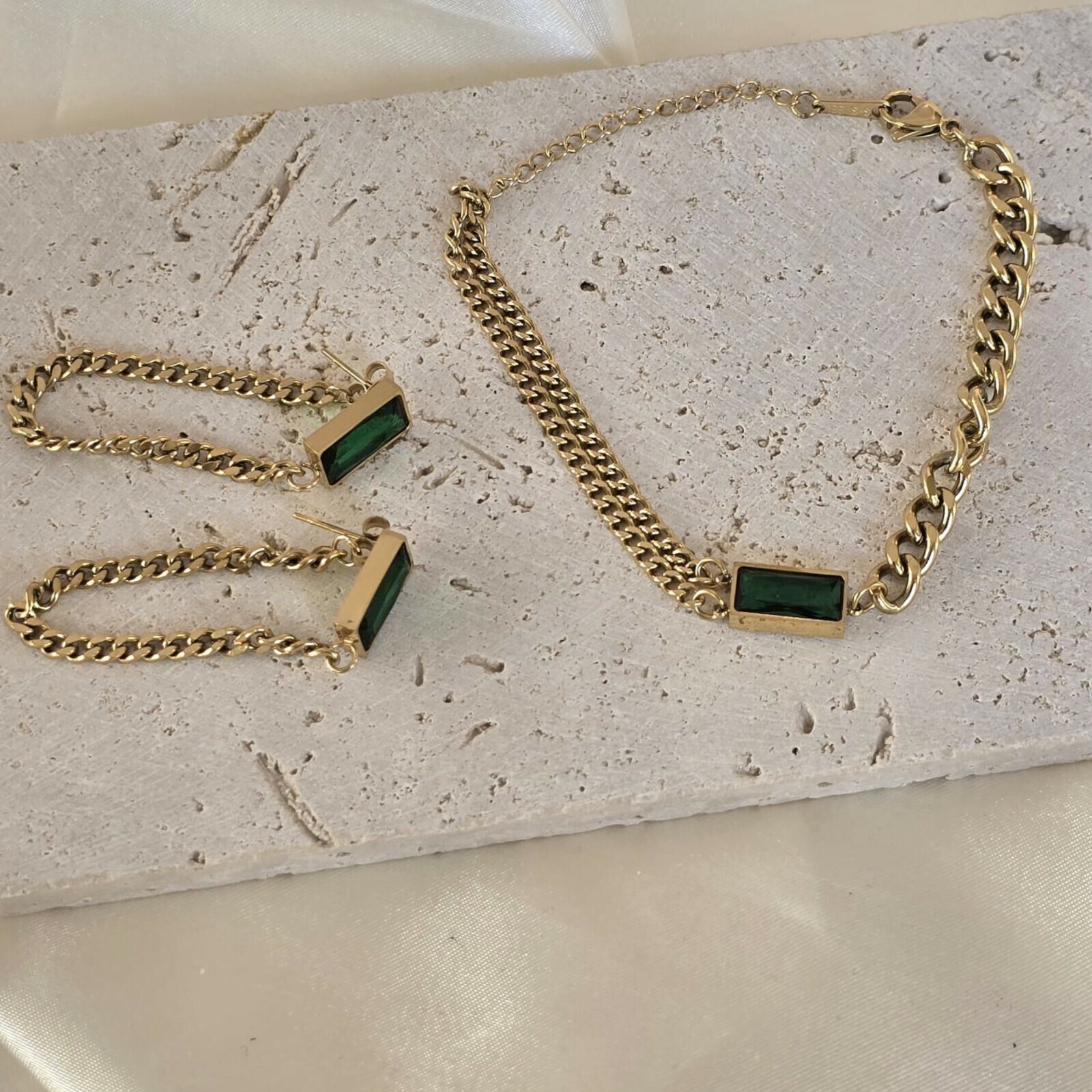 Elevate your accessory game with this elegant jewelry set from LAPRECIEUZ DE ARTHES, featuring a stunning pair of earrings and a matching link chain bracelet, both expertly crafted in 18K yellow gold-Plated finish and adorned with radiant green zircon stones ? a sophisticated nod to the May birthstone (Emery style).
