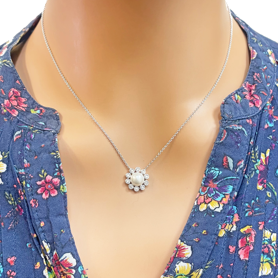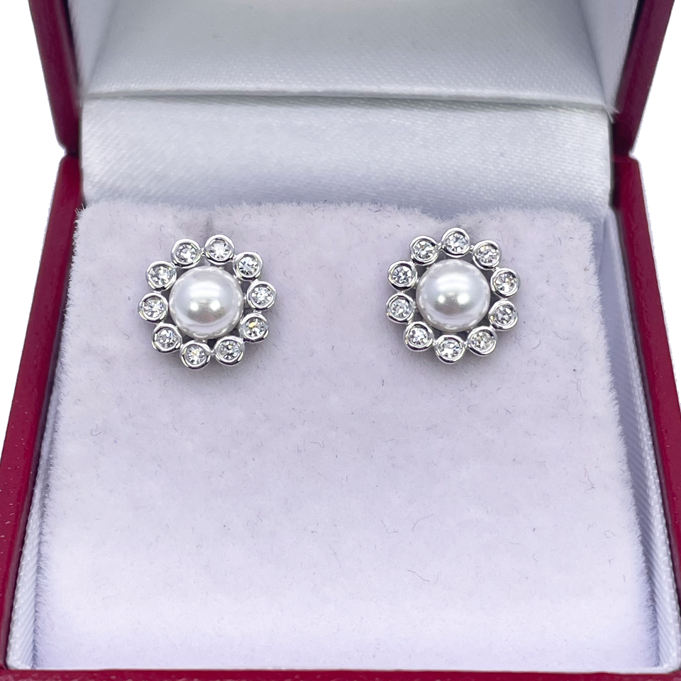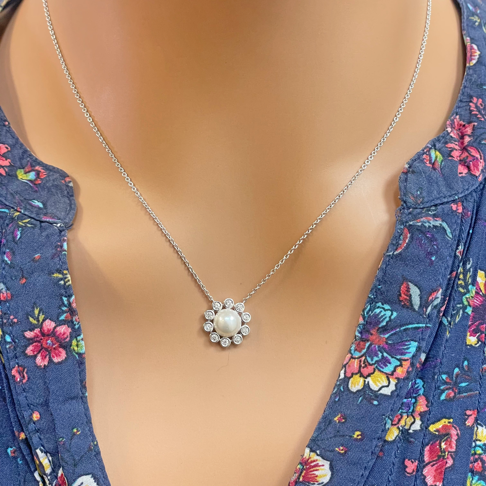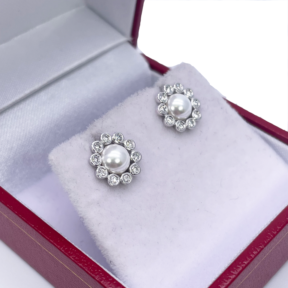 - 18ct White Gold Diamond & Pearl Floral Necklace/Earrings Set 2.73ct