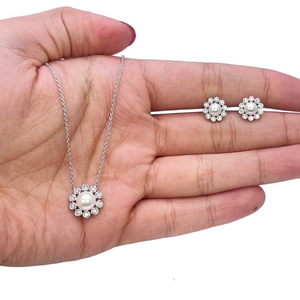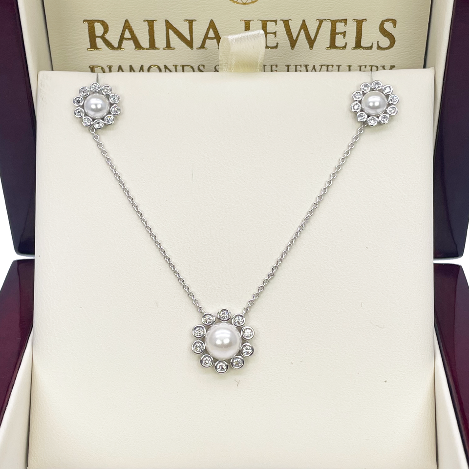18ct White Gold Diamond Pearls Floral Necklace/Earrings Set 2.73ct