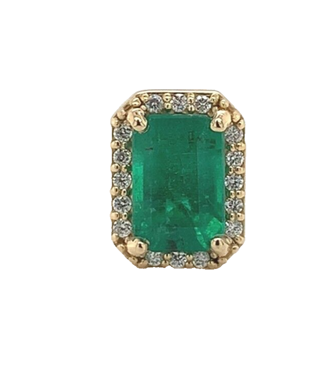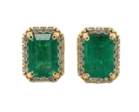 A pair of 18k yellow gold genuine earth mined emerald stud earrings with diamond halos. The emerald cut emeralds measure about 6mm x 4mm and have medium dark color and fine clarity. The emeralds weigh 1.16 carats total. There are thirty-two tiny round diamond accents weighing .08cts total.