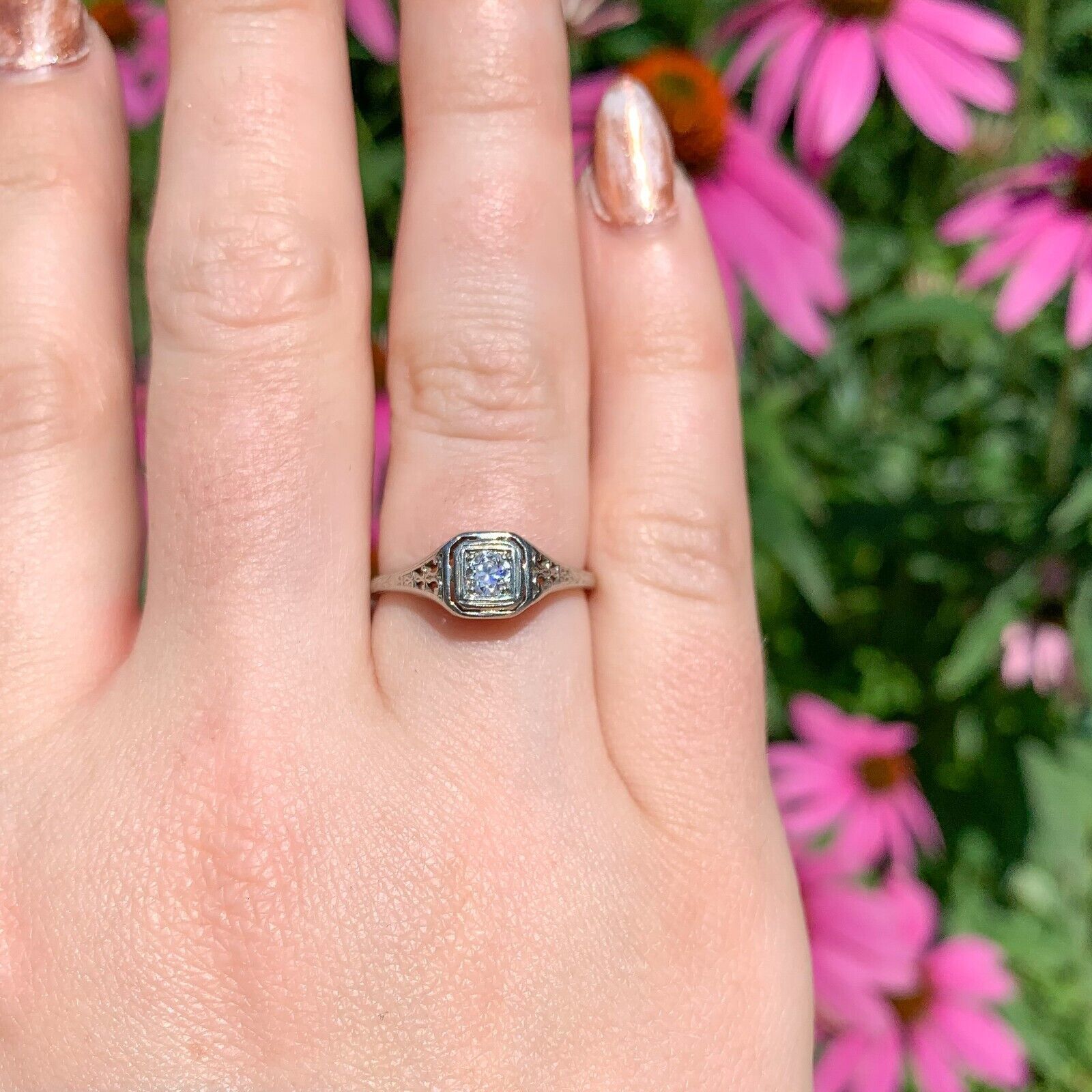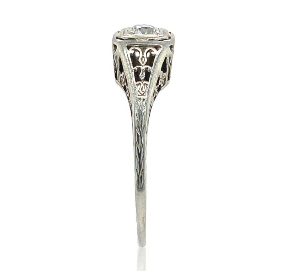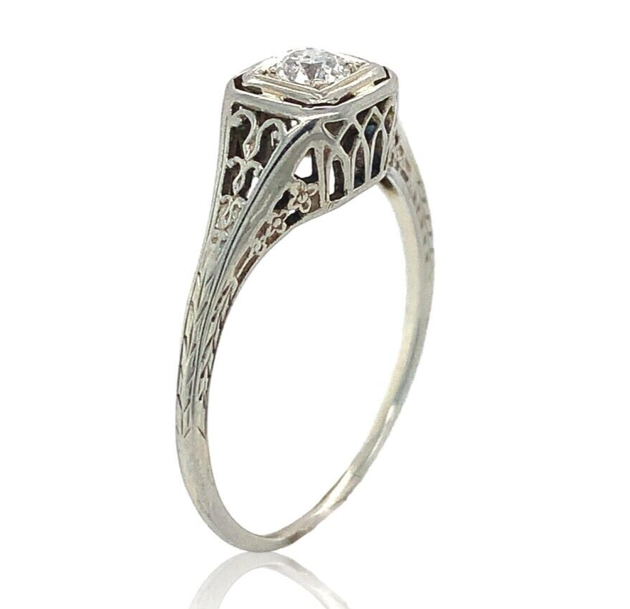 18k white gold filigree ring featuring a European cut diamond weighing about .15cts. The diamond has I1 clarity and H-I color. It measures about 3.3mm. The ring fits a size 7.75 finger, and weighs 1.37 dwt. It dates from the 1920s. Beautiful!