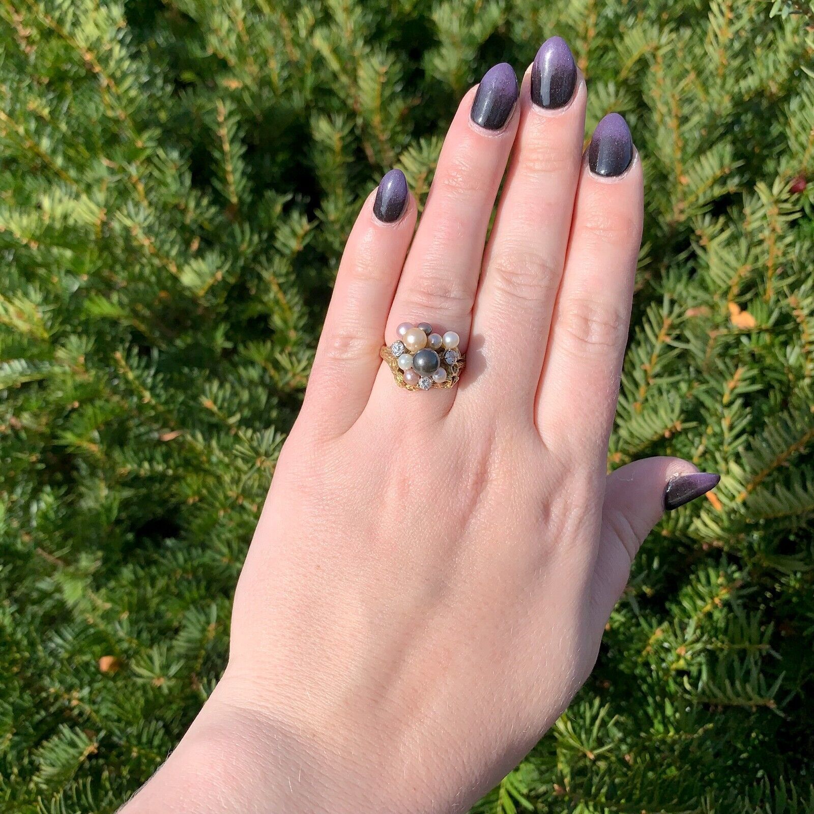 18k Yellow Gold Black White and Pink Pearl and Diamond Ring Size 6.5 (#J7080)
