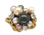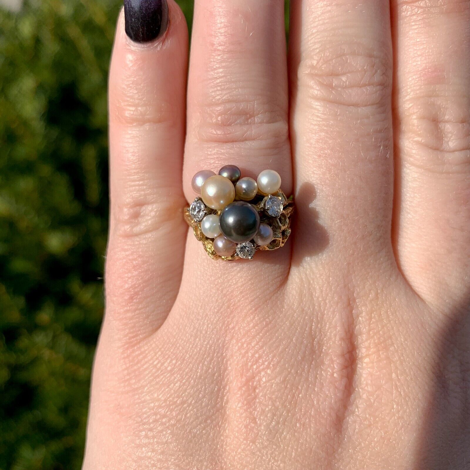 Heavy 18k yellow gold cultured pearl ring with diamonds. There are nine cultured pearls of various colors and sizes. The largest is the black pearl which measures about 6.2mm. There are three round diamonds. Two of the diamonds are European cut, and the other is a round brilliant cut. The diamonds measure about 3mm to 3.3mm and weigh about .12cts each.