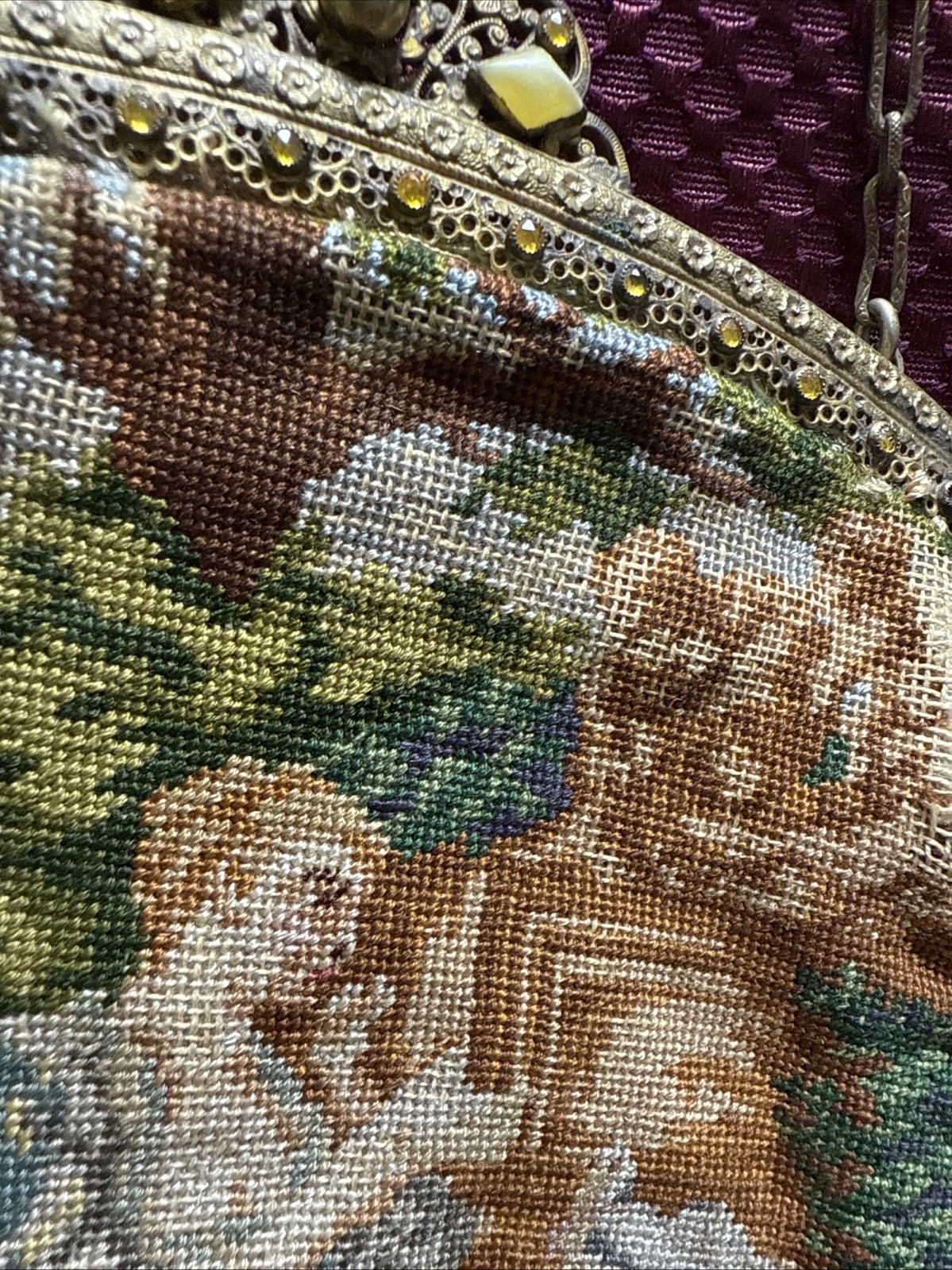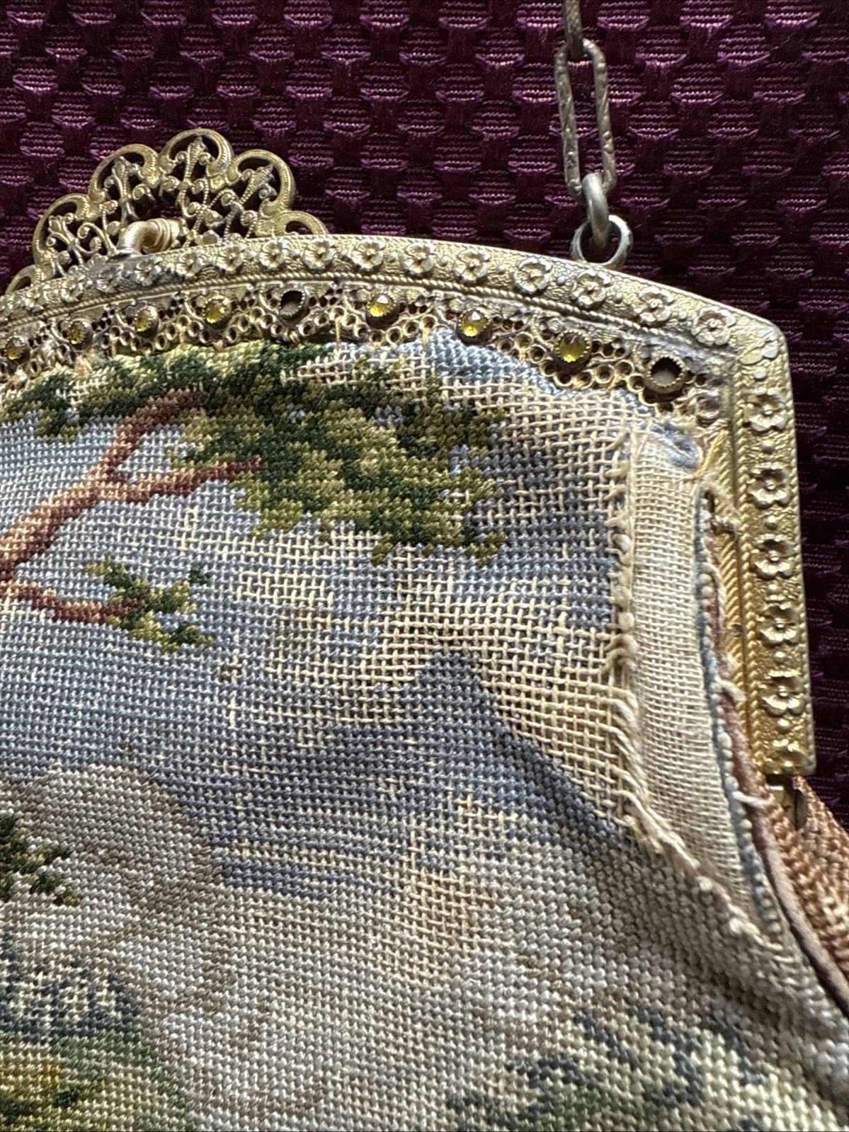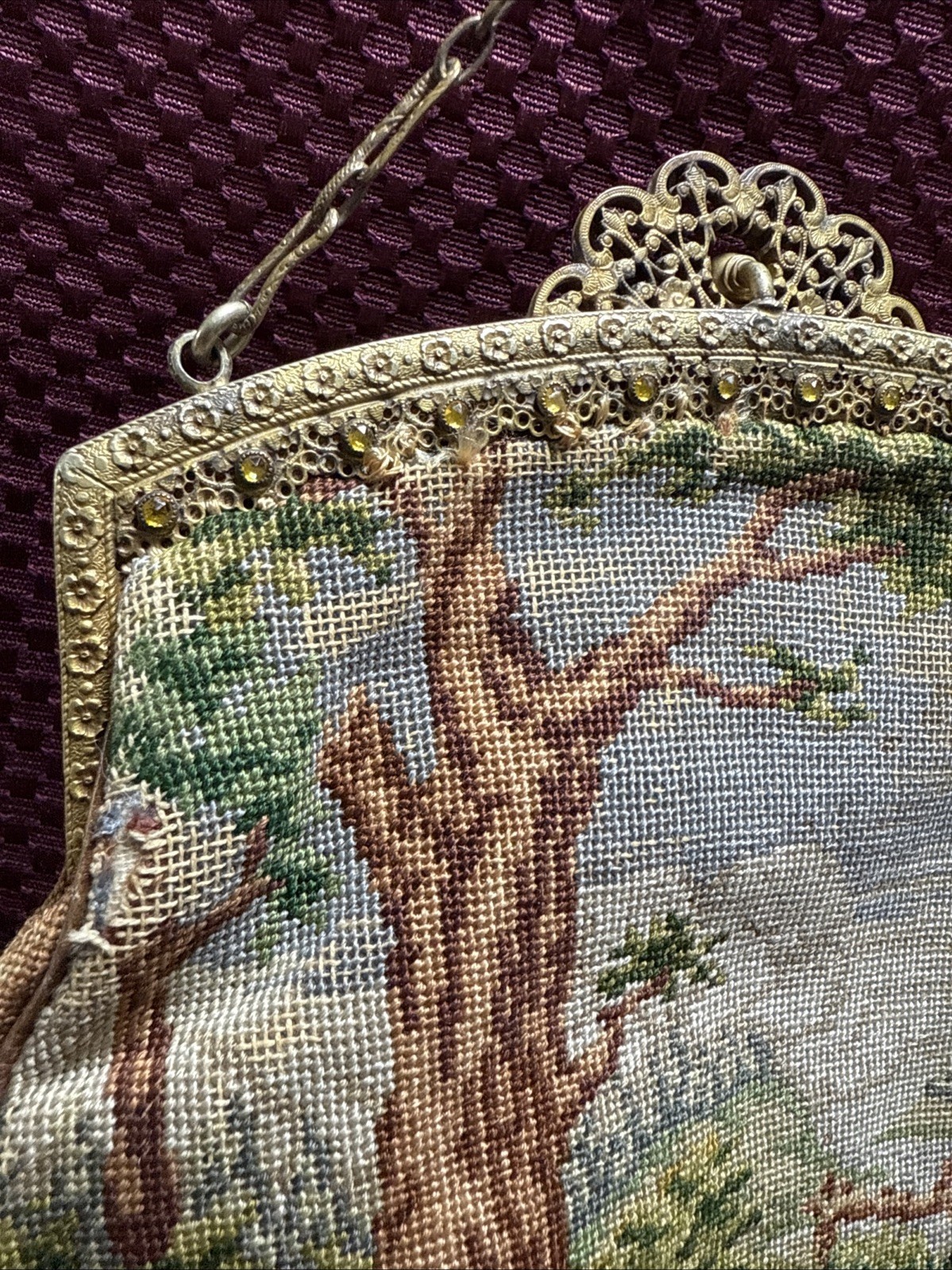 1900?s Original Antique Tapestry Jeweled Purse Bag Gold Vintage Edwardian Era Original vintage early 1900?s Tapestry needlepoint purse with jewels and interesting clasp See photos for for sizing measurements and condition yourself ornate metal clasp , The clasp features intricate filigree work with embedded rhinestones or faux gemstones, including a central pearl-like bead and diamond-shaped stones, which are characteristic of early 20th-century craftsmanship, likely from the 1900s to 1920s. The needlepoint below depicts a detailed scene with trees and possibly figures, typical of petit point or tapestry bags popular during that era, often used as elegant evening accessories. The combination of materials and design suggests it?s a vintage piece, possibly from the Edwardian or early Art Deco period.