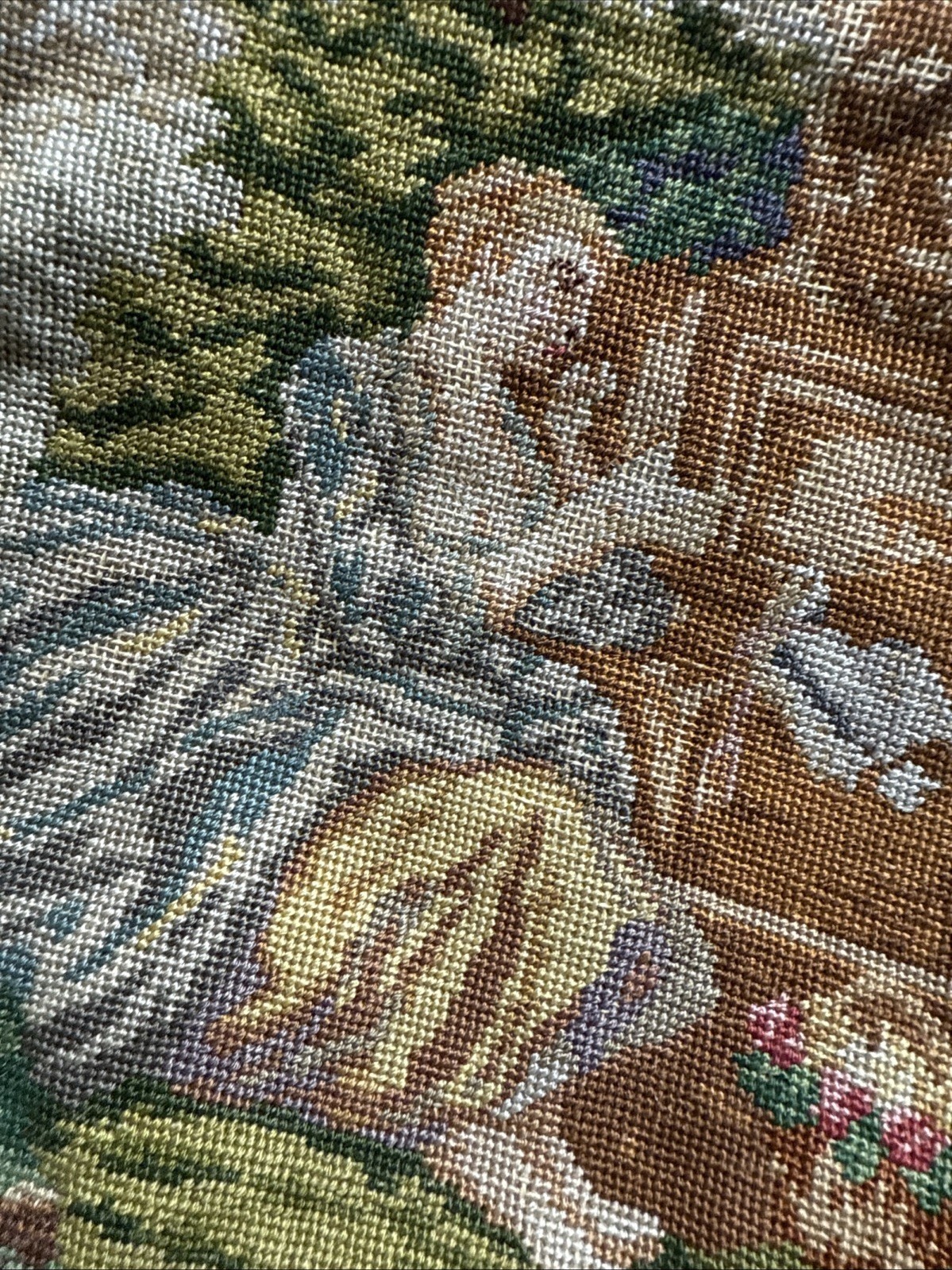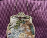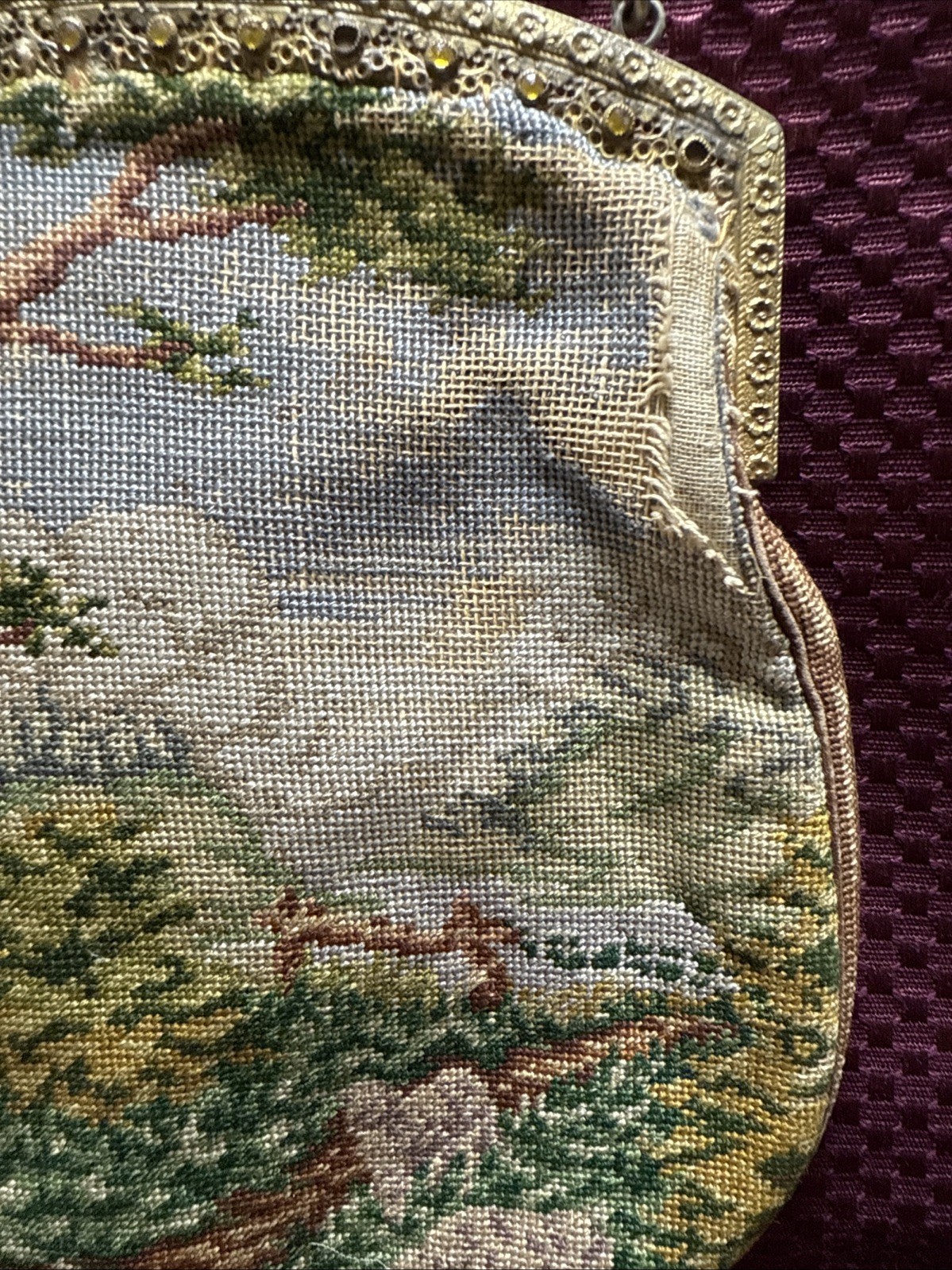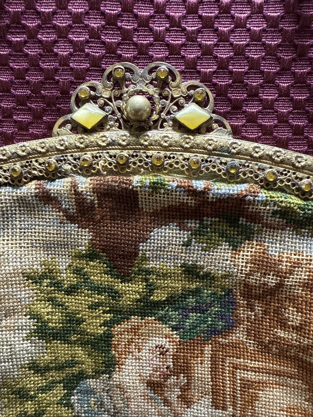 1900?s Original Antique Tapestry Jeweled Purse Bag Gold Vintage Edwardian Era Original vintage early 1900?s Tapestry needlepoint purse with jewels and interesting clasp See photos for for sizing measurements and condition yourself ornate metal clasp , The clasp features intricate filigree work with embedded rhinestones or faux gemstones, including a central pearl-like bead and diamond-shaped stones, which are characteristic of early 20th-century craftsmanship, likely from the 1900s to 1920s. The needlepoint below depicts a detailed scene with trees and possibly figures, typical of petit point or tapestry bags popular during that era, often used as elegant evening accessories. The combination of materials and design suggests it?s a vintage piece, possibly from the Edwardian or early Art Deco period.
