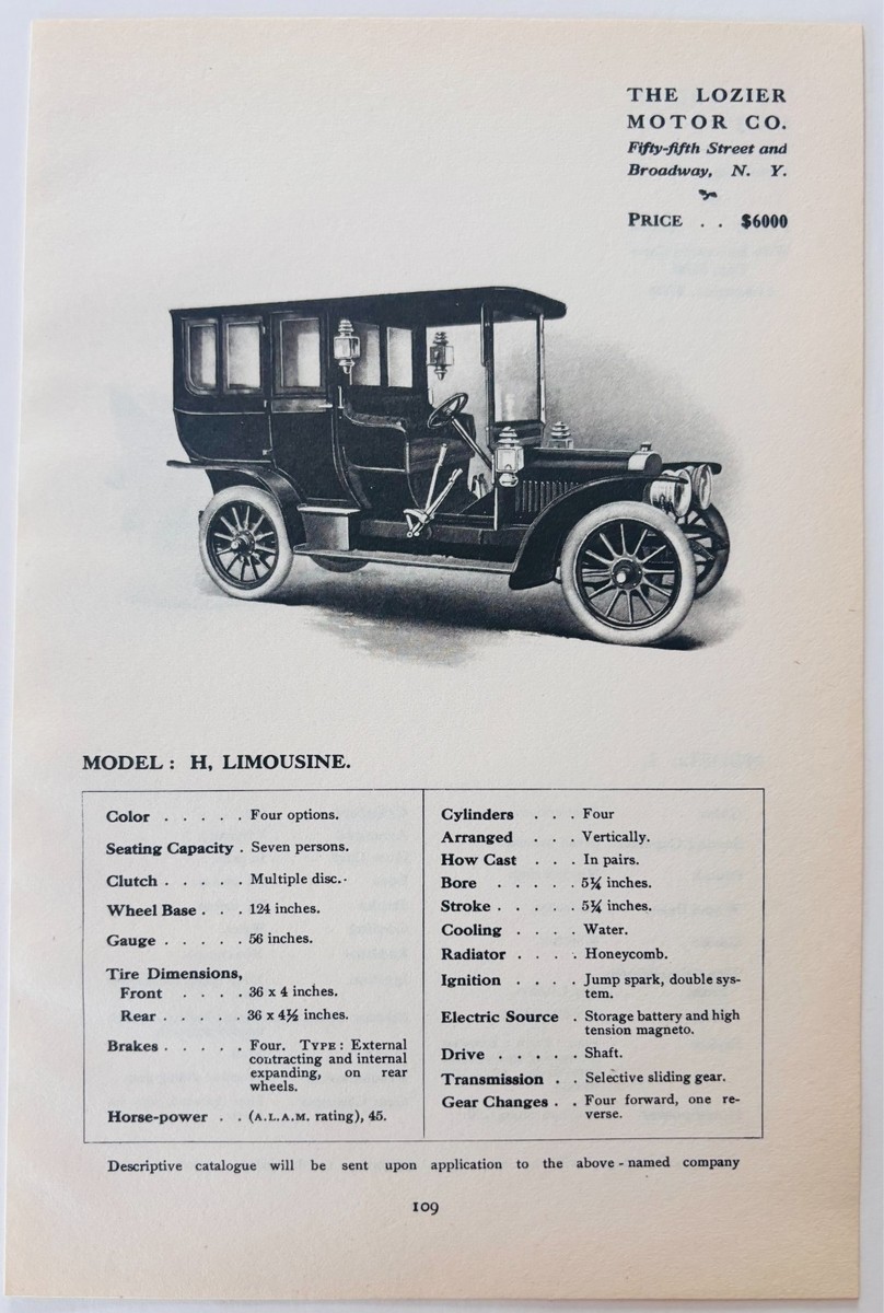 1908 Lozier Motor Co Model H Limousine Catalog Advertisement Automobilia F17M1