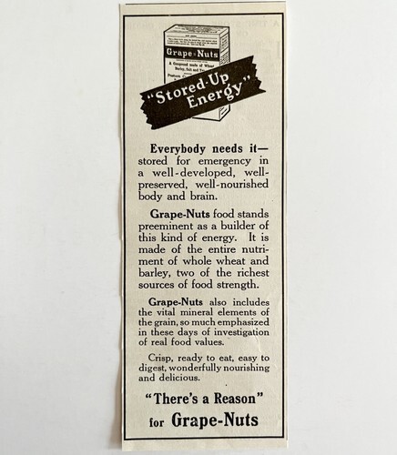 Primary image for 1916 Grape Nuts Cereal Stored Up Energy Advertisement Food Ephemera DWMYC4