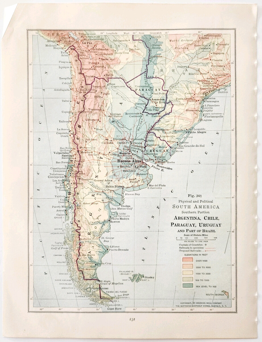1916 Map South America Political Chile Argentina Paraguay Uruguay Brazil DWSS8