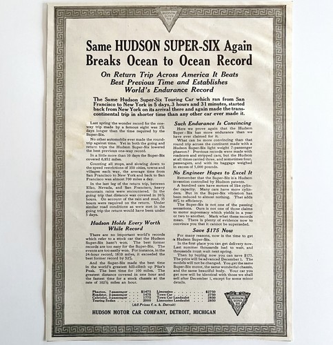 1916 Hudson Motors Super Six Record Advertisement Automobilia Ephemera DWMYC3