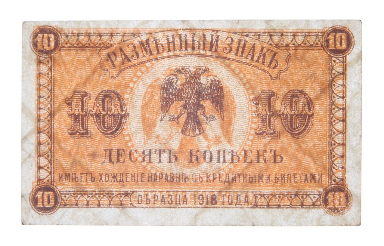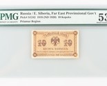 Scelle dans un support PMG avec le titre "Russie / E. Siberie, Far Orient Orient Gov't // Pick # S1242 1918 (nd 1920) 10 Kopeks // Priamur Region"