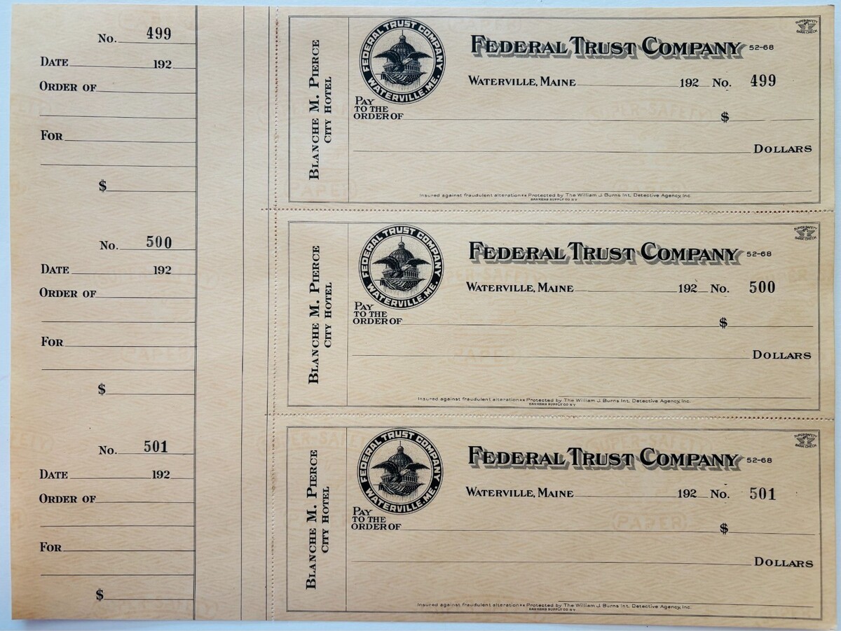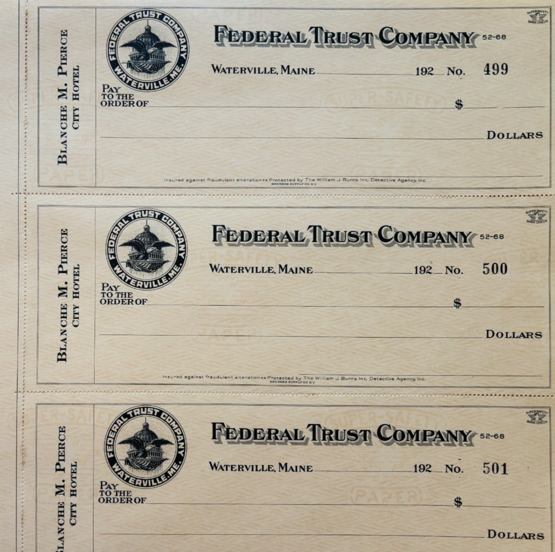 1920 Federal Trust Checks Lot of 3 City Hotel Waterville Maine 499-501 F18C2