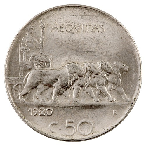 - 1920 ITALY-R 50 CENTESIMI PIECE PLAIN EDGE
