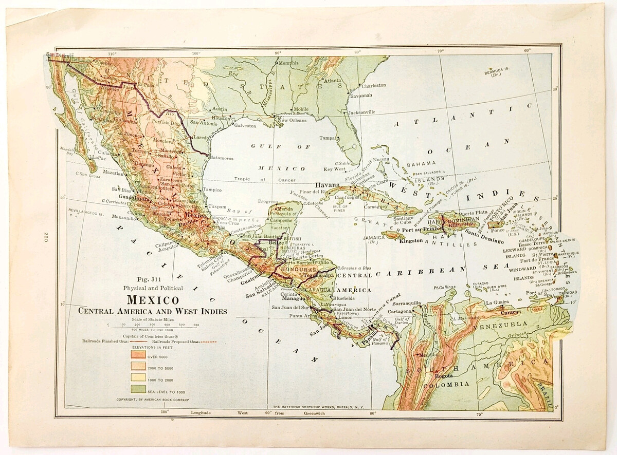 1920 Map Mexico Physical Political Central America West Indies Cuba DWQ4