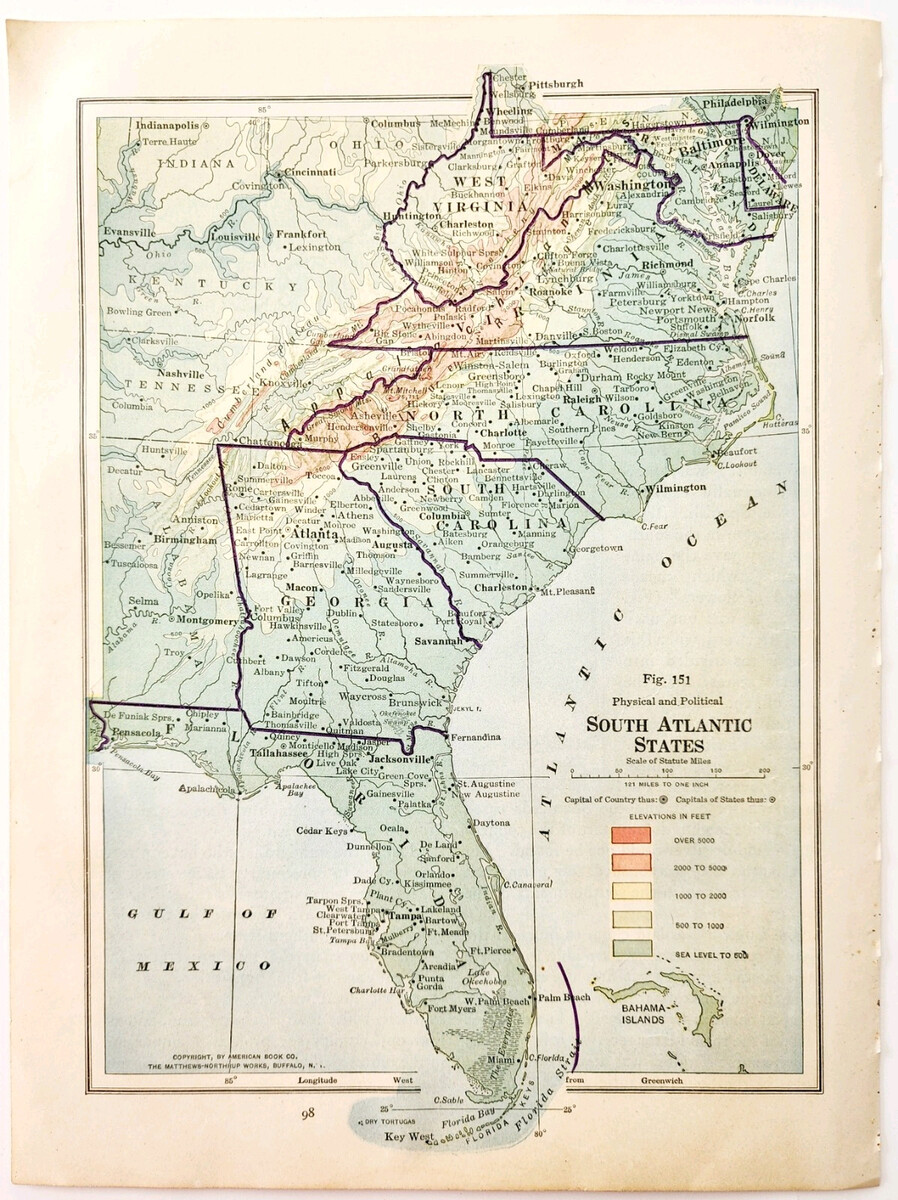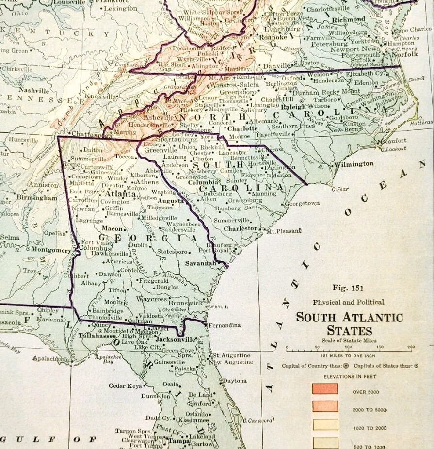 1920 Map South Atlantic States Physical Political Virginia NC SC GA FLA DWQ4