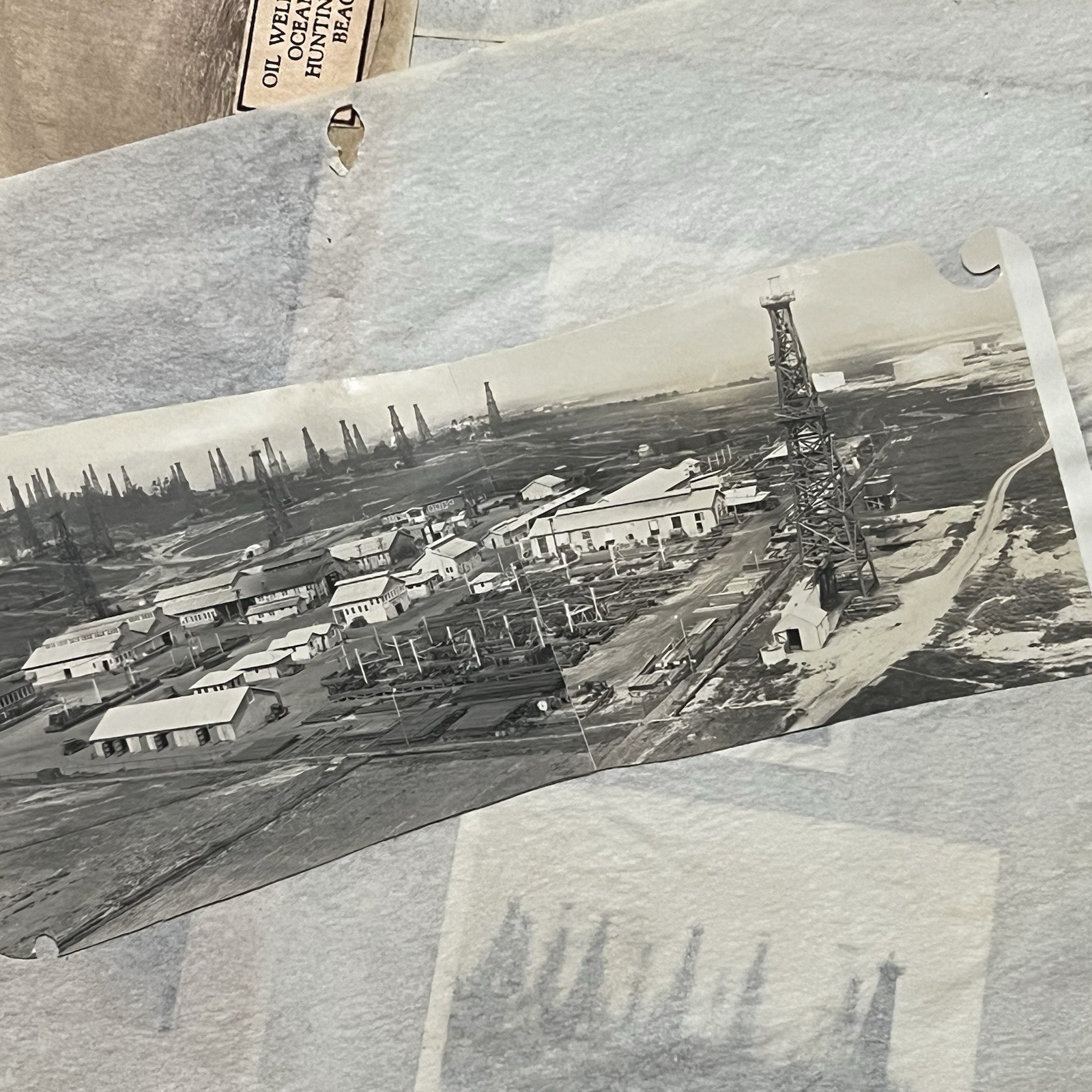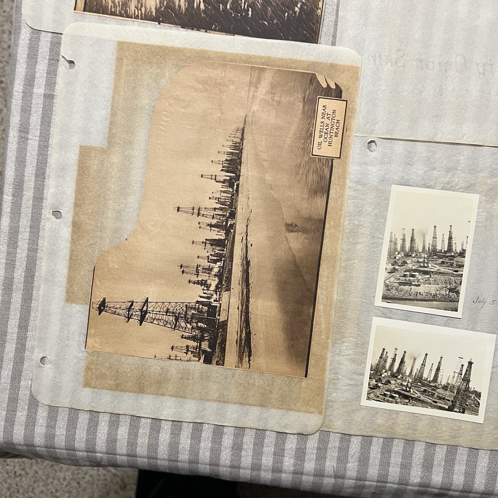 All of these pages were in the album between the two newspaper clippings about Huntington Beach Oil Fields. There is only one notation on a page that says "July 5, 1928"