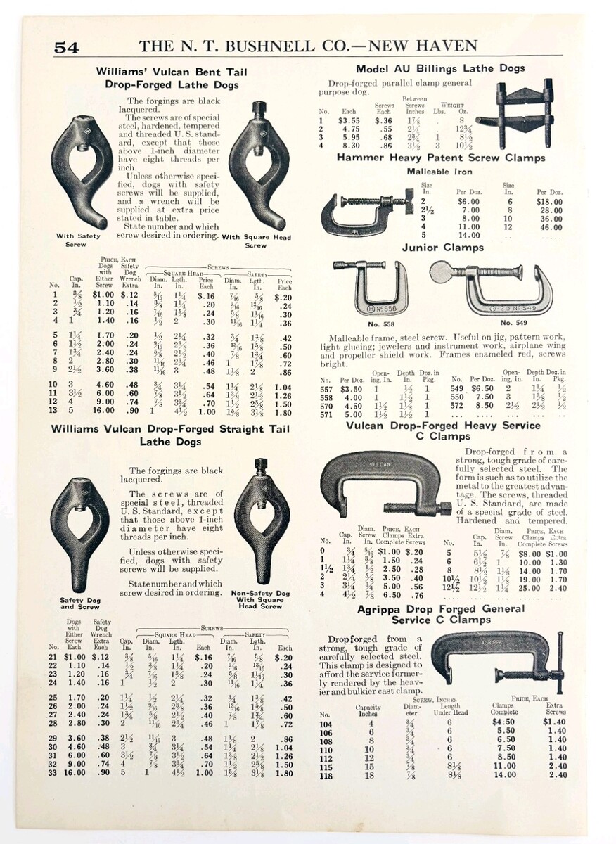 1922 N.T. Bushnell Lathe Dogs C Clamps Tool Advertisement Catalog Hardware DWA21
