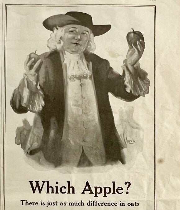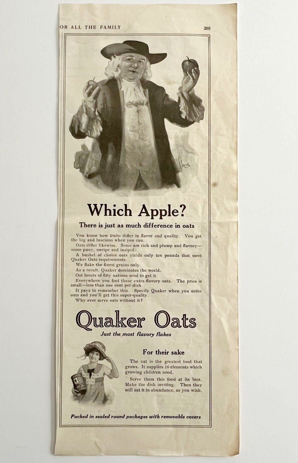 1923 Quaker Oats Cereal Puffed Rice Wheat Advertisement Which Apple Approx 14 x 5.5" In good antique display condition with obvious signs of wear and age including staining, small tears, ruffled edges, etc...inspect pics closely. Tons more toys, collectibles, paper, antique, vintage ephemera, maps, engravings, prints, vinyl, vhs, media, books, bags, handmade and more! Will combine shipping! LGAD1923B
