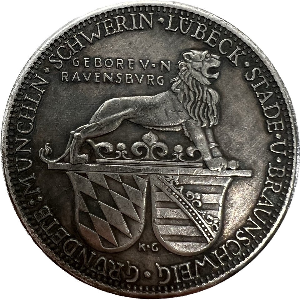 En el reverso, el majestuoso leon, un poderoso emblema relacionado con el gobierno de Enrique y su asociacion con la ciudad de Braunschweig, se muestra de manera prominente. La inscripcion "MÜNCHEN" en la parte superior y "GEBORE V.N RAVENSBVRG" en la parte inferior indican aún mas el significado historico del lugar de nacimiento de Enrique. Esta moneda no es solo una reproduccion moderna; encapsula el diseño detallado y los elementos cautivadores de la pieza original.