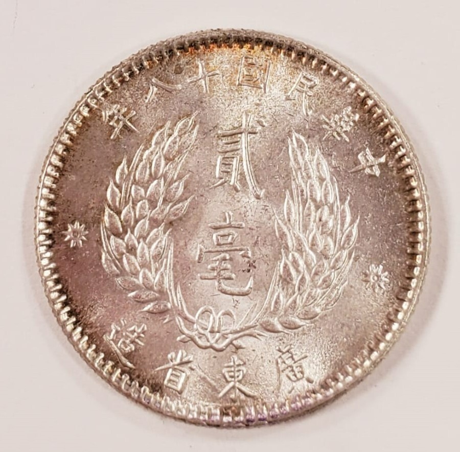 - 1929 (Yr18) China Kwangtung Provincial 20 Cents Silver Coin, AU. Y# 426