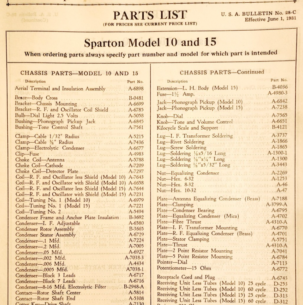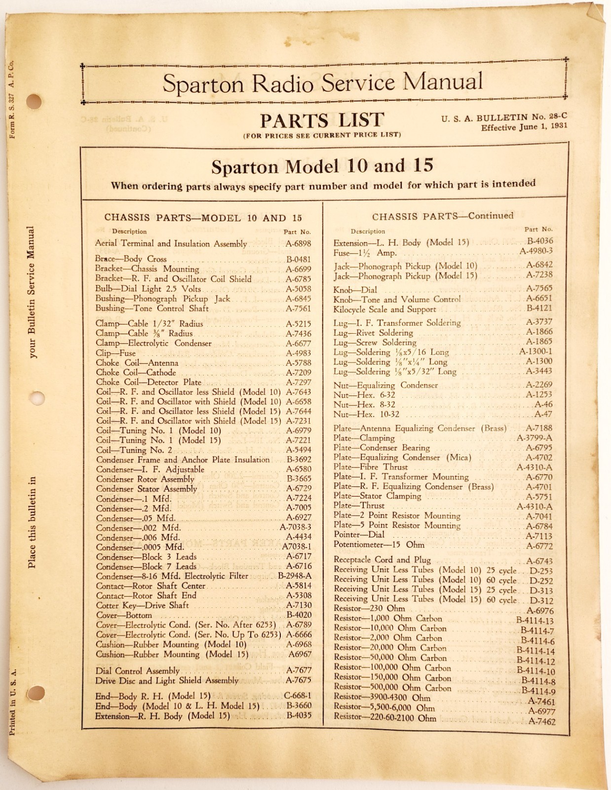 1931 Sparton Radio Model 10 And 15 Parts List Electronics Ephemera F20A