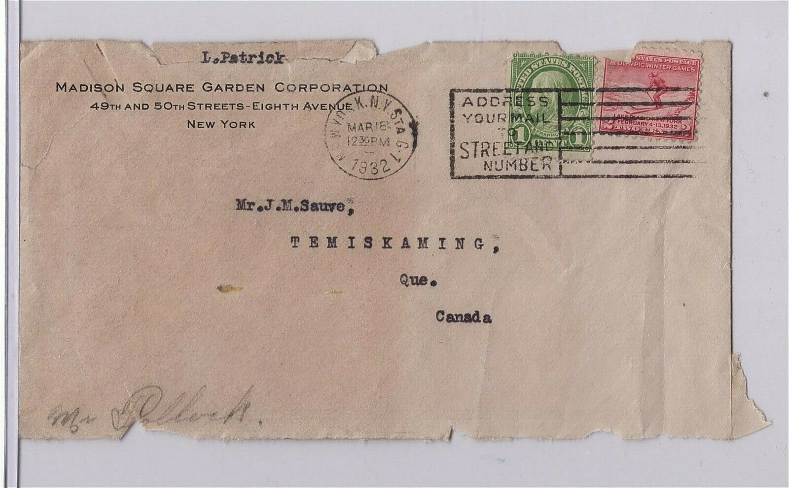 1932 NY RANGERS - MADISON SQUARE GARDEN CORPORATION - ENVELOPE SENT FROM LESTER PATRICK - POSTMARKED MARCH 18, 1932!! LESTER PATRICK USED THIS ENVELOPE TO MAIL SOMETHING TO A MAN IN TEMISKAMING, QUEBEC, CANADA