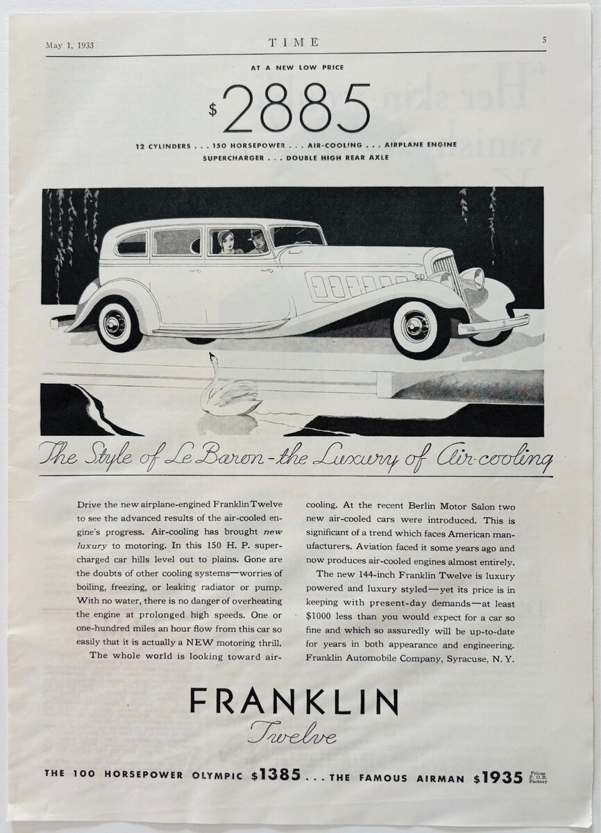 1933 Franklin Twelve Olympic & Airman Advertisement Automobilia Antique F18B1
