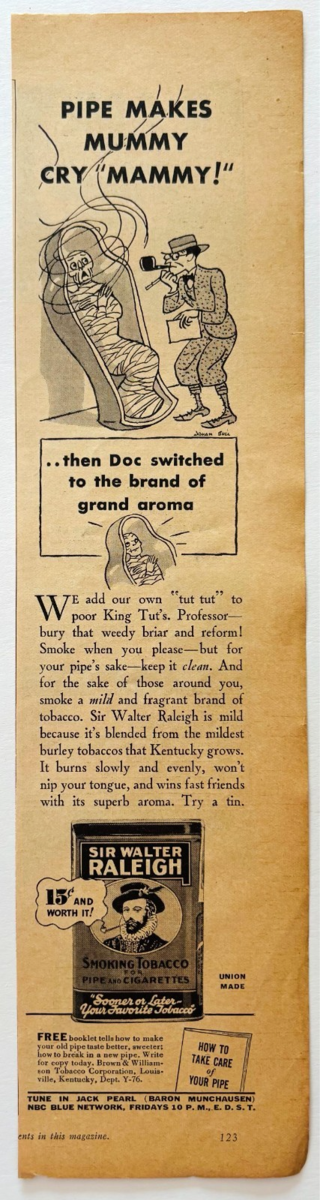 1937 Sir Walter Raleigh Pipe Tobacco Advertisement King Tut Mummy E90F2