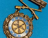 1. Top bar that indicated either Army level or Corps / department level competition and served as a brooch to affix the assembled device to the uniform. The top bar is squared ended and ornamented with oak leaves, and was always worn with this bronze clasp and an enameled planchet prior to WWII. The top bar or brooch is a pin back with a functional rotating clasp closure.
